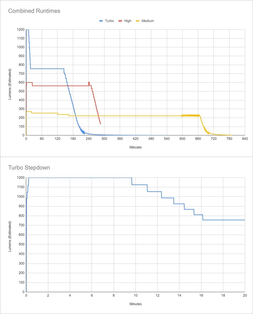 Disclaimer: All these runtime graphs are scaled based on the assumption that the official lumen ratings for each mode are correct.