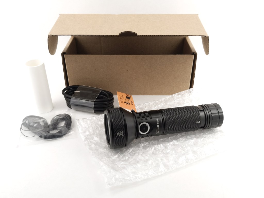 The box is typical of Sofirn. It’s relatively thin cardboard with a little foam pad on the bottom. The light comes in a bubblewrap sleeve so it should be reasonably well protected during transport. It has a piece of insulating paper in the tailcap and a piece of paper rubber banded around the head to remind you to remove the insulating paper. Inside the box you’ll find the following items: