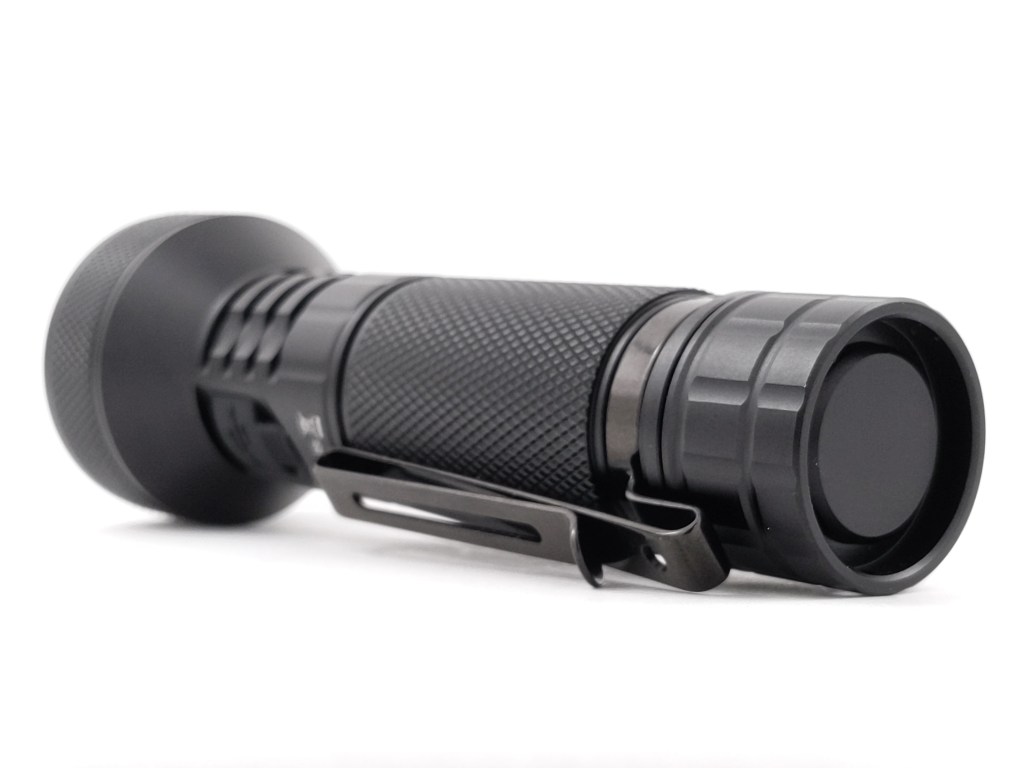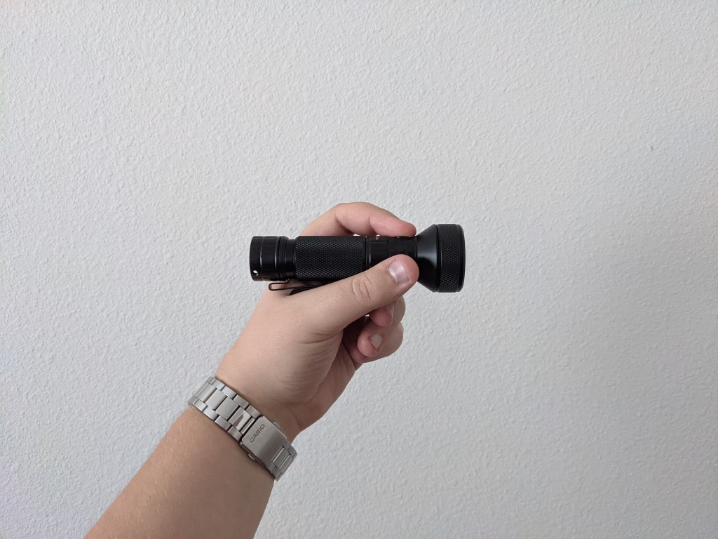 The light feels fine in the hand. The knurling provides plenty of grip without being aggressive. The clip stays put and is a great way to find the button, which is in an accessible spot. It’s not a perfectly sculpted ergonomic masterpiece but it’s not bad either. A forward grip works best. That’s what it was clearly designed for, but a pencil grip works too.