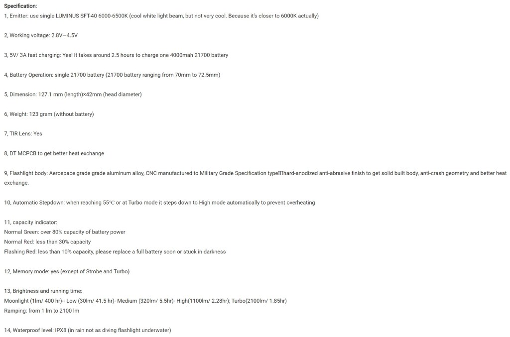 Sofirn sent me this light in exchange for a honest review. Here is the official product page but you can also buy it on Amazon for a markup and fast shipping. Below are the official specs.