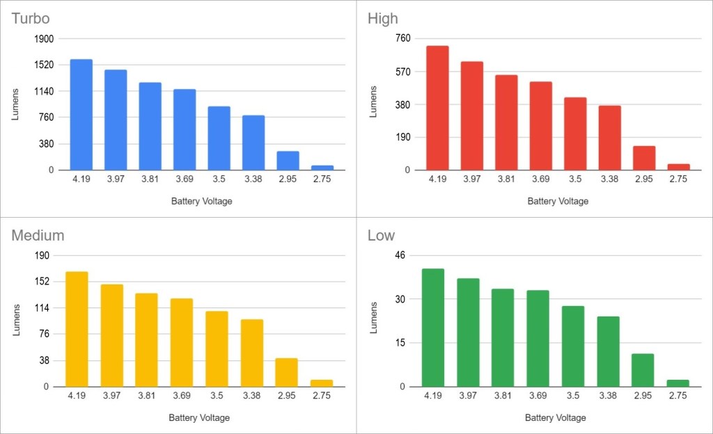 On every mode I tested, brightness pretty much directly followed cell voltage. There’s not much regulation going on here. This is a basic, direct-drive driver so this poor regulation is to be expected. It would have been really great to see Sofirn re-use SP35’s excellent buck driver here.