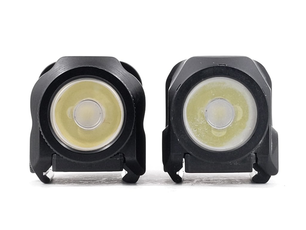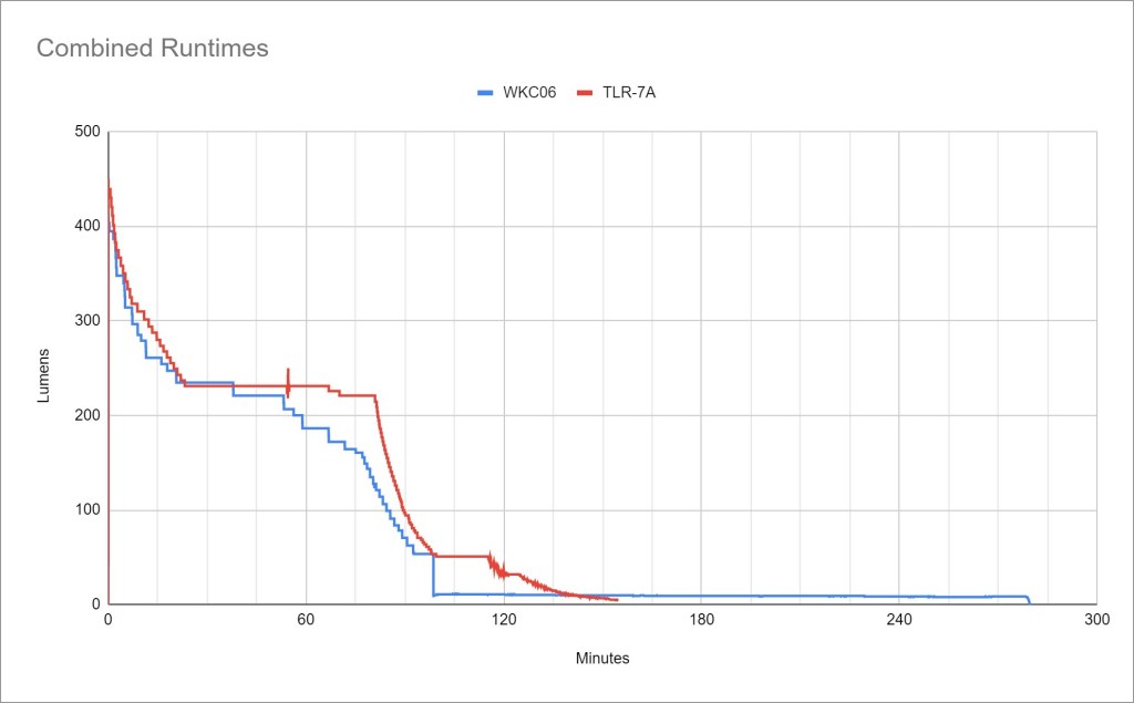 Neither WKC06 nor TLR-7A met their advertised 500 lumen rating, but they got within a stone’s throw. I measure lumens on a Texas Ace Calibrated Lumen Tube and there’s some margin of error. I’ll call these “close enough” to the factory spec.