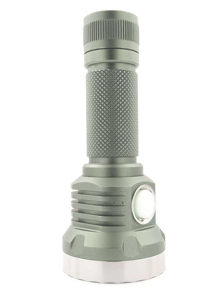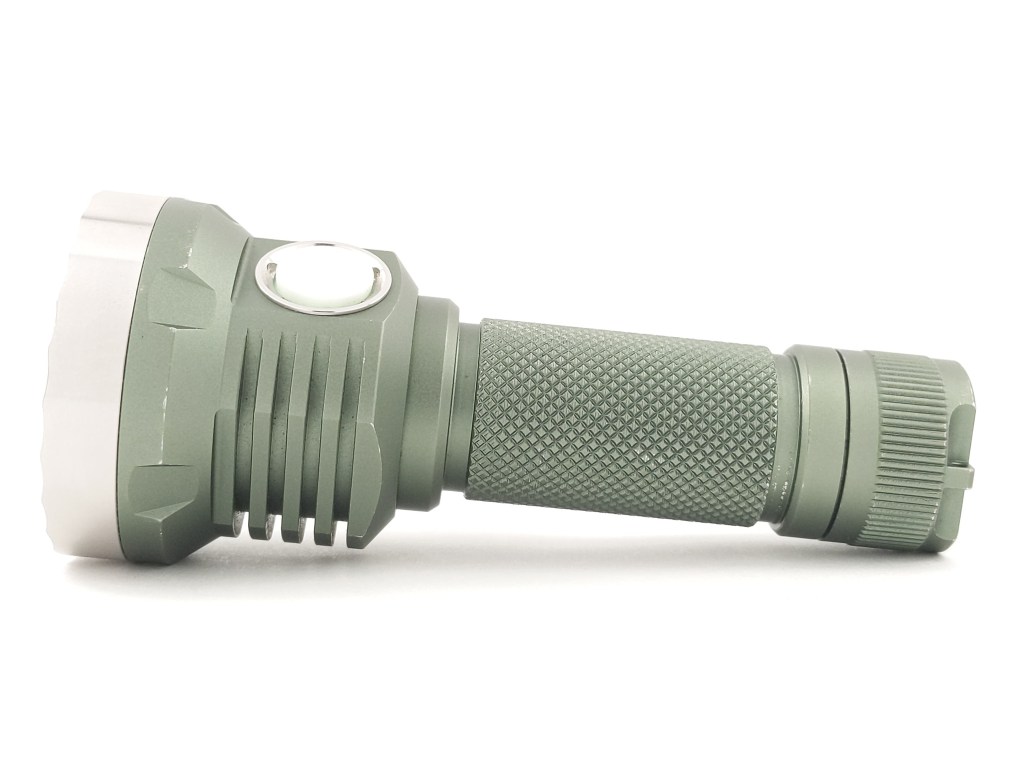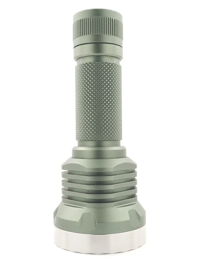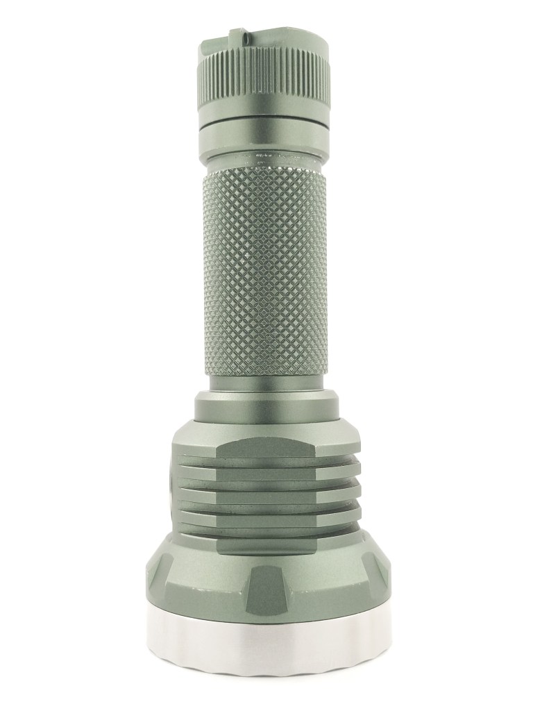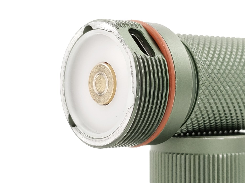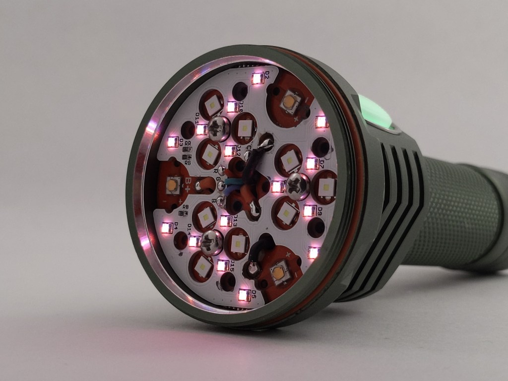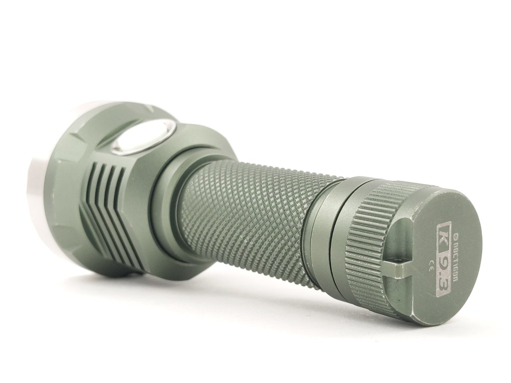K9.3 is available with a huge variety of emitter options. This particular sample has a pretty unique set. Channel 1 is Osram W1 greens, and channel 2 is SST20 2700K’s. Even more unique is that this sample has elliptical optics installed over the W1’s so the beam is a wide ellipse instead of a circle. It’s very weird and very cool. The 2700K channel is round, floody, and very warm.