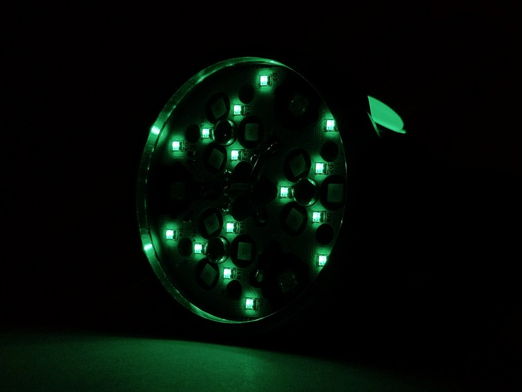 K9.3 uses a two-channel driver. Channel 1 is connected to the main set of 9 LED’s (W1 greens in this case). It’s 9A+FET construction, so from 0 to 9 amps it’s driven linearly, and above that it’s driven by the FET with PWM to regulate brightness. Channel 2 is connected to the secondary set of 3 LED’s (SST20 2700K’s in this case). It’s a 5A linear construction, so it’s fully regulated but can’t get nearly as bright as the main channel. Use the slider below to compare the regulation and brightness of both channels!