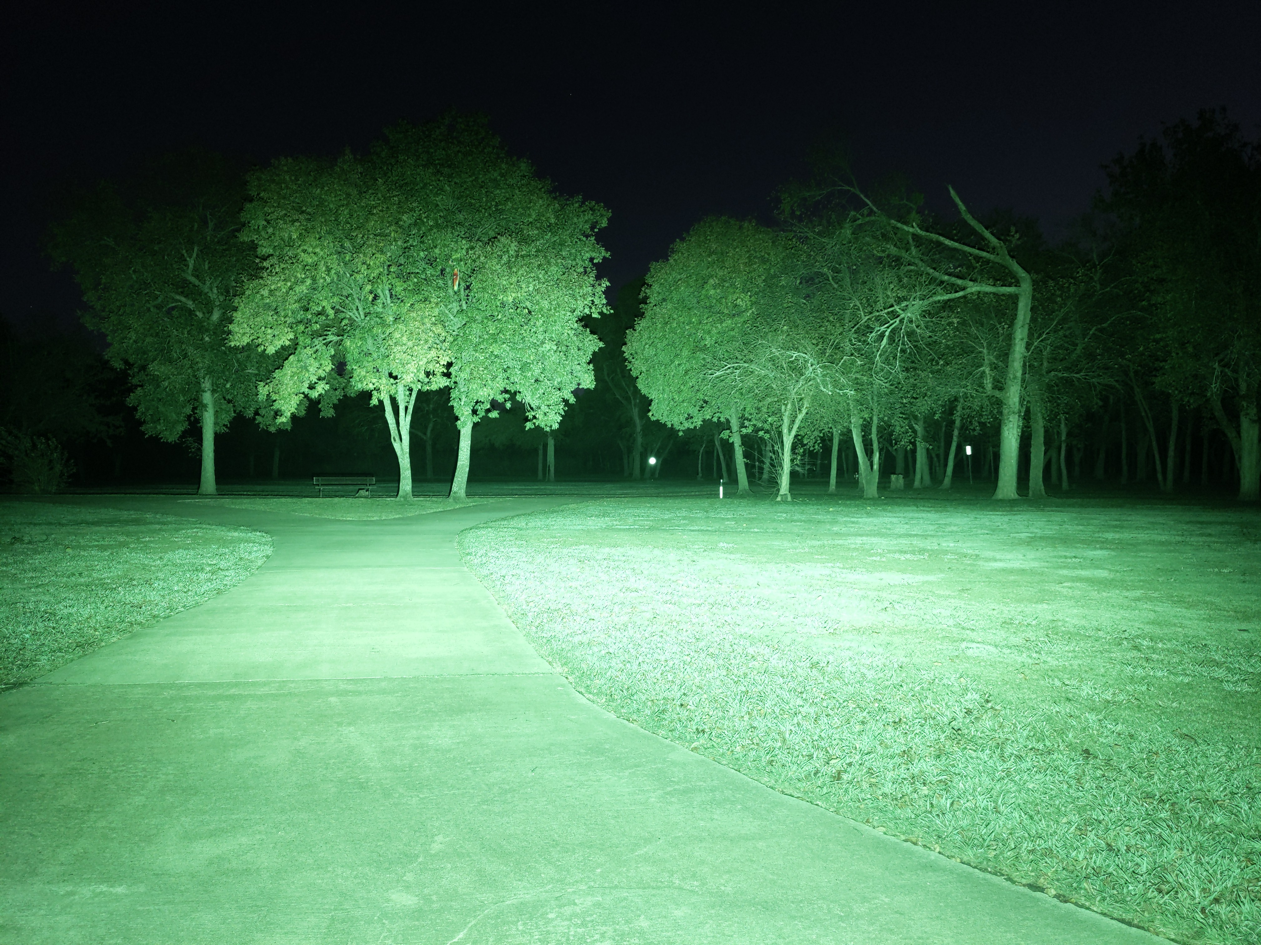 Outdoors, the green spreads out wide without wasting too much light up into the sky or down right at your feet. This elliptical beam would be perfect for a bike light. I can’t think of any other practical use cases for it though.