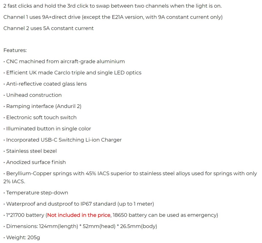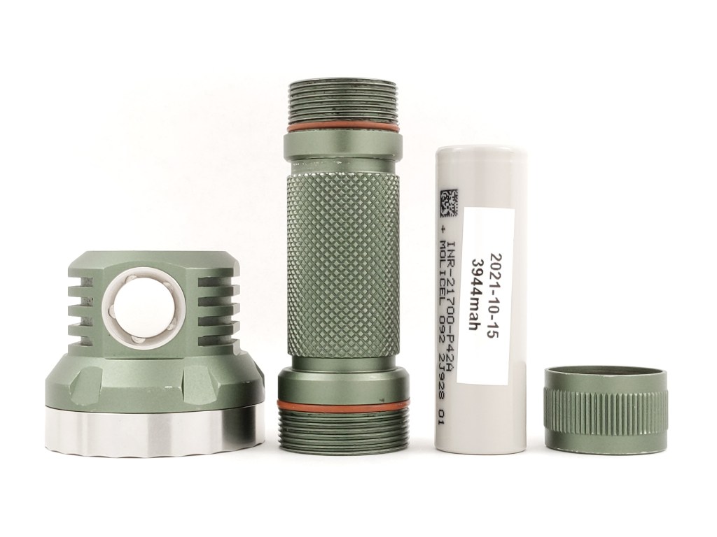K9.3 uses an unprotected, flat top, 21700 battery. You can’t buy one with the light from the manufacturer, so you’ll have to buy a battery separately. For the Nichia emitter options on channel 1, a 5000mah cell with a 10A discharge rating will be fine. But for all other options you’ll want to use a higher discharge cell if you want maximum output. I’m using a Molicel P42A for my testing. 18650’s will work in a pinch, even unprotected flat tops.