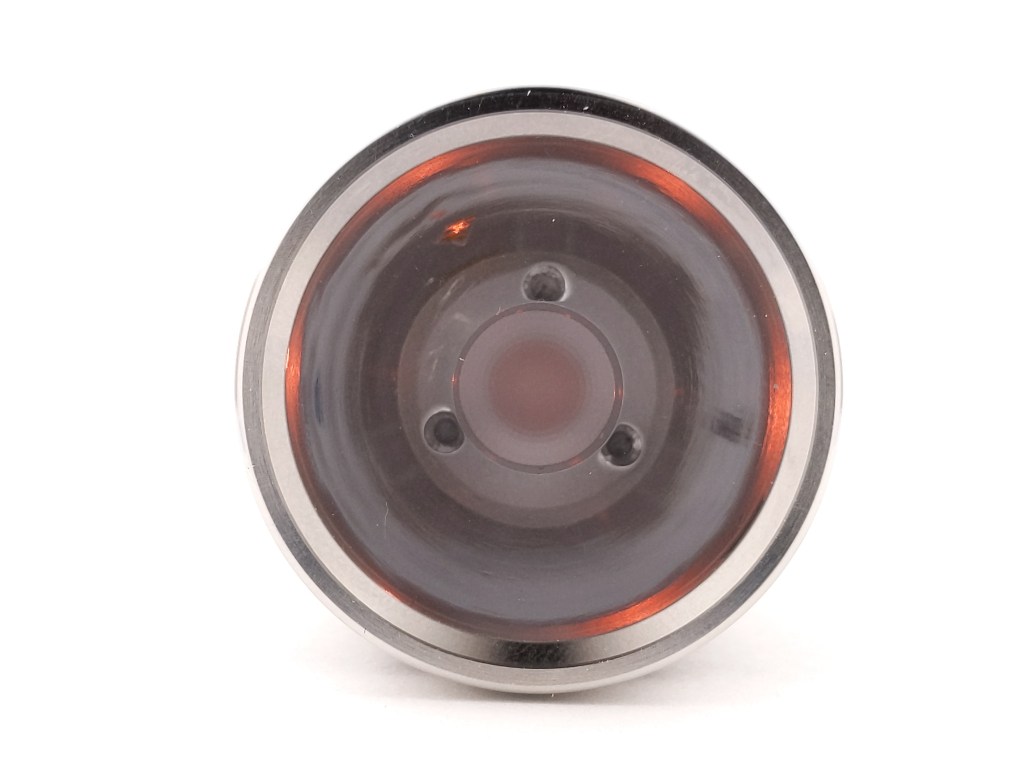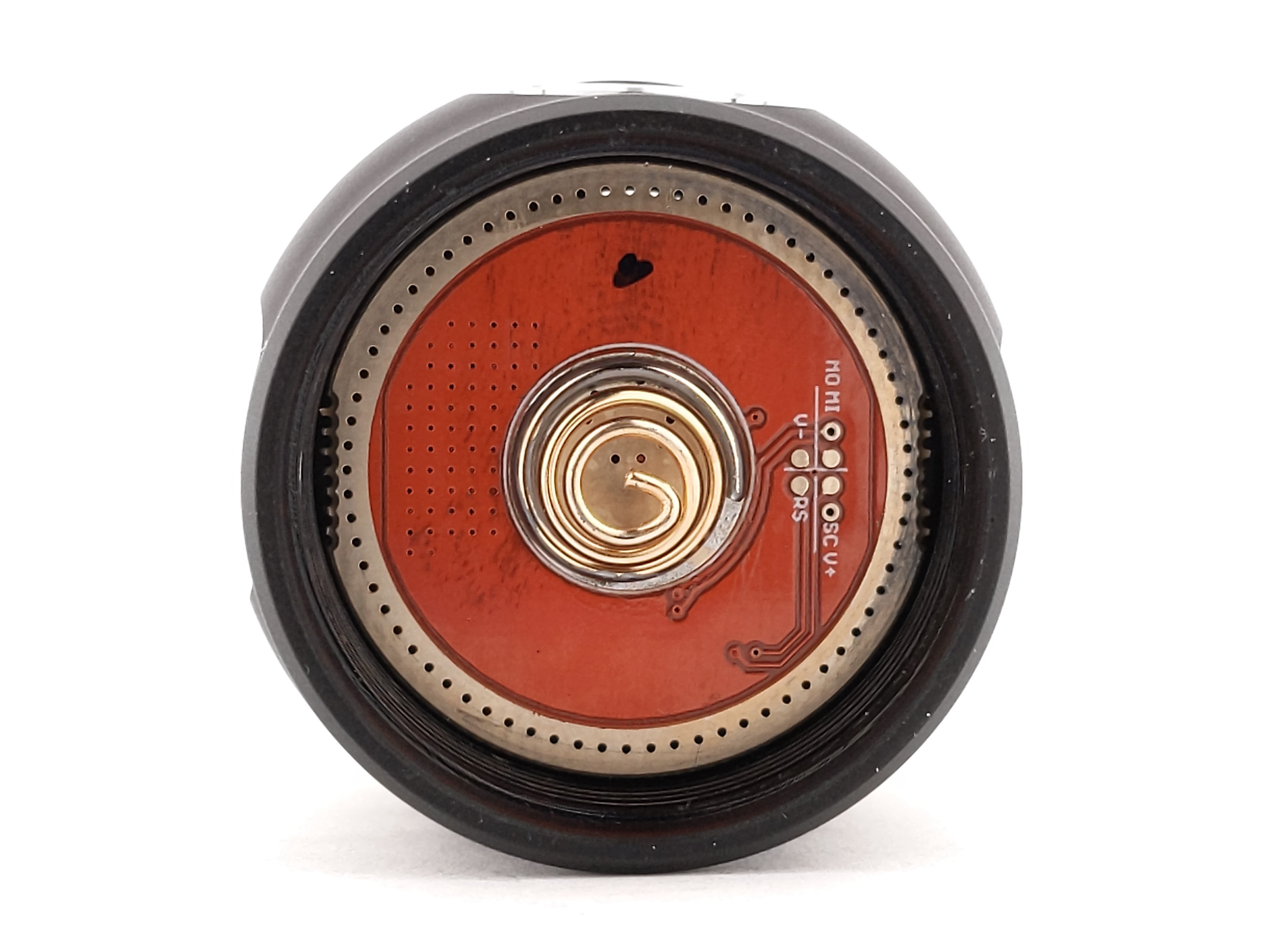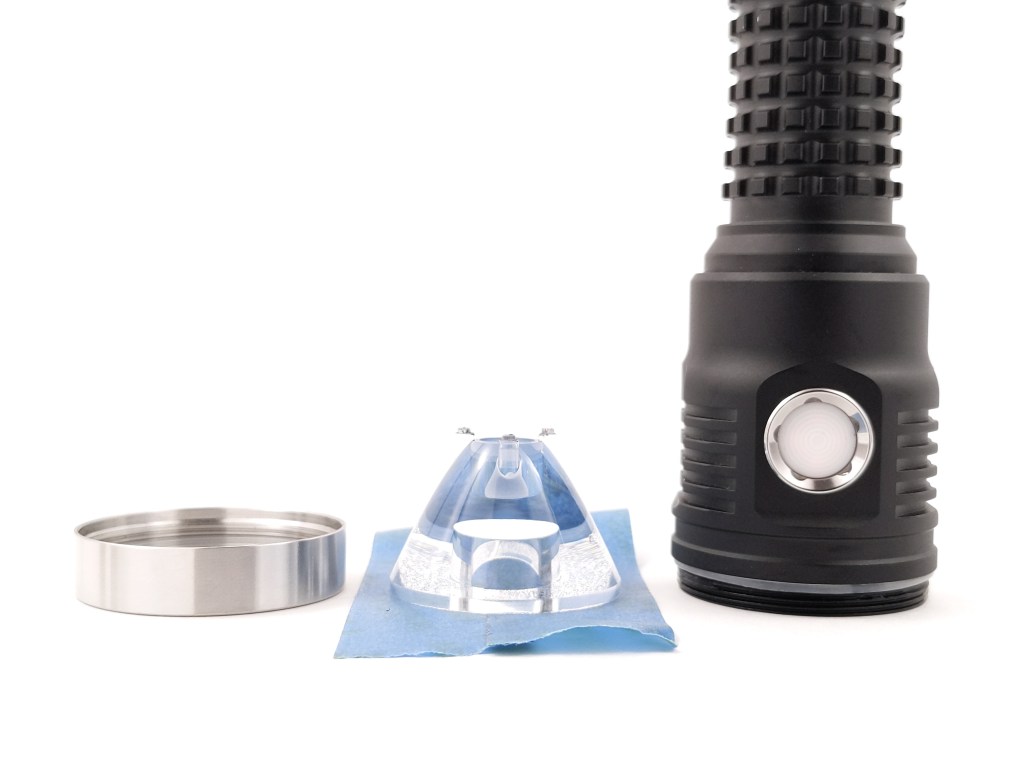 The emitter sits behind a large TIR optic. It’s pretty difficult to remove & reinsert, so I don’t recommend doing so unless you absolutely must. Oddly, B35’s optic is higher than W1’s. Instead of its legs sitting in the little holes in the MCPCB, there are little red risers inserted into the holes. Without those holes, there’s nothing to locate the optic on the MCPCB and it’s very difficult to get it perfectly aligned. Do not remove the optic if you have a B35AM unless you absolutely have to.