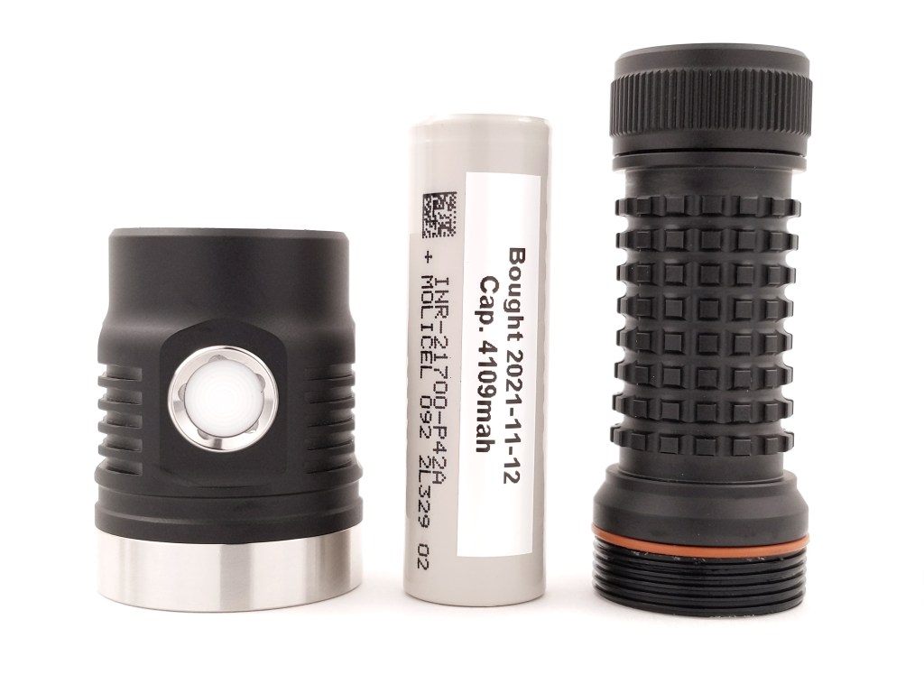 DM11 uses one, unprotected, flat top, 21700 battery. Currently there are no emitters offered with extremely high power draw, so any of the ~5000mah ~10A discharge cells on the market should work fine. I’m using a Molicel P42A for my testing, but I tried a Molicel P26A 18650 as well and it worked reliably. The battery has to be purchased separately, and no charging solution is included.