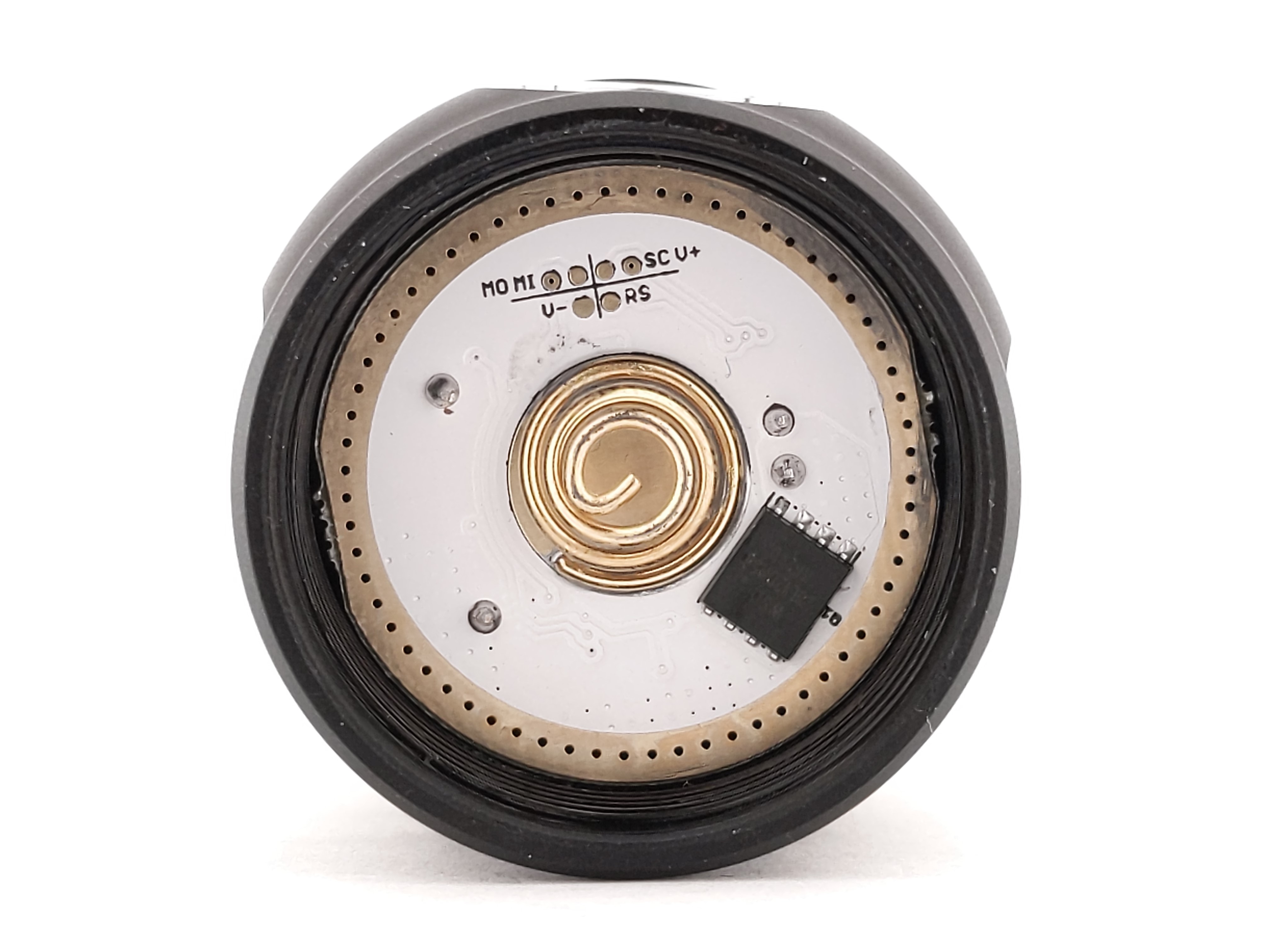 DM11 has a few different drivers depending on your emitter choice. There are three linear drivers (5, 7.5, or 9 amp) and two boost drivers (12V 2A for XHP35-HI, and 6V 3.6A for B35AM). My samples are a 5A linear driver for Osram W1, and the 6V driver for B35AM. The drivers available appear to be virtually identical to those found in Noctigon K1. As you can see above, the boost driver has some components on the visible side, where the linear driver doesn’t. Hank’s awesome flashing pads are present too, allowing for quick and easy firmware updates.