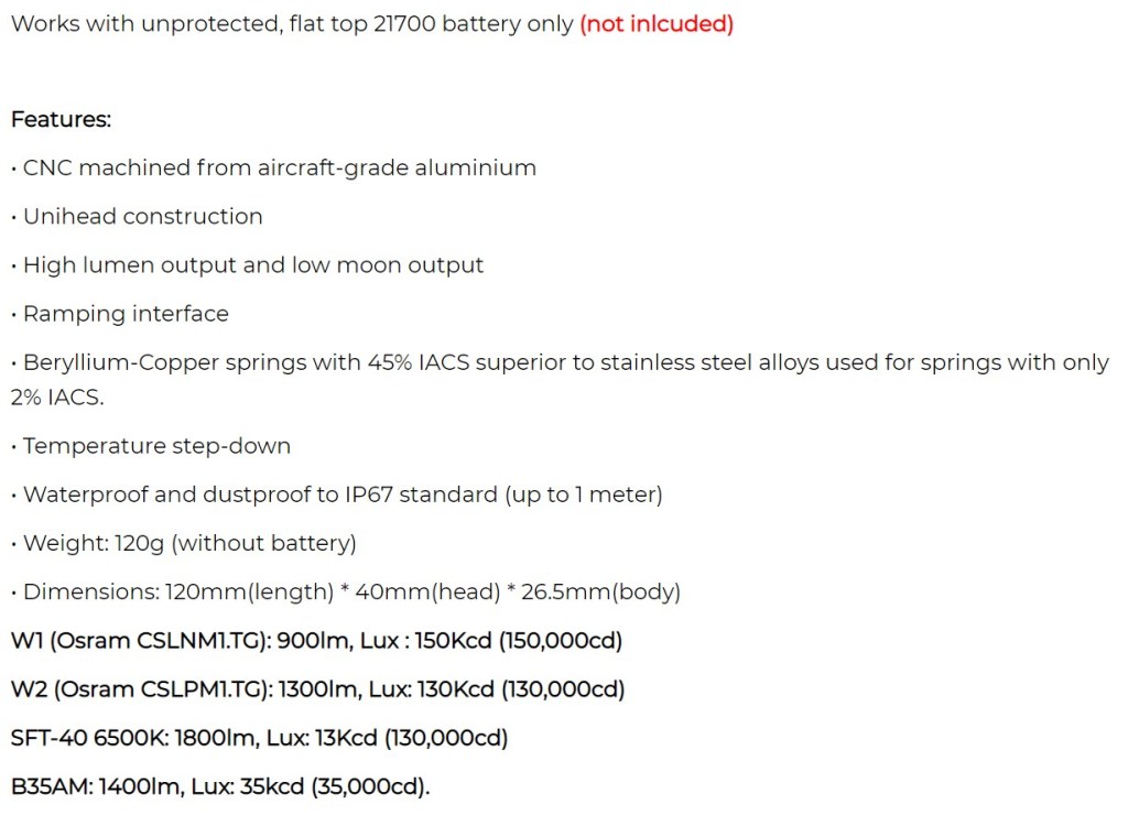I purchased these lights with my own money from the manufacturer at full price. One has an Osram W1, and the other has a Nichia B35AM 3500K. Here is the official product page. Below are the official specs at the time of writing. They’ve changed once since the light was released, so be sure to check the current listing.