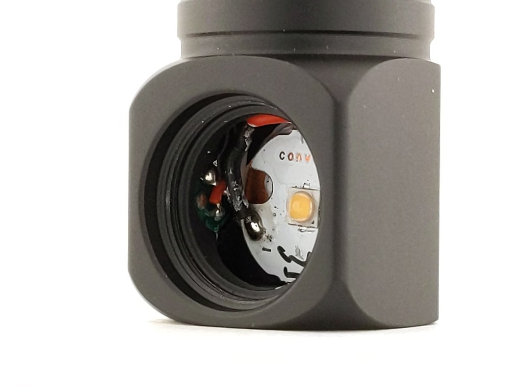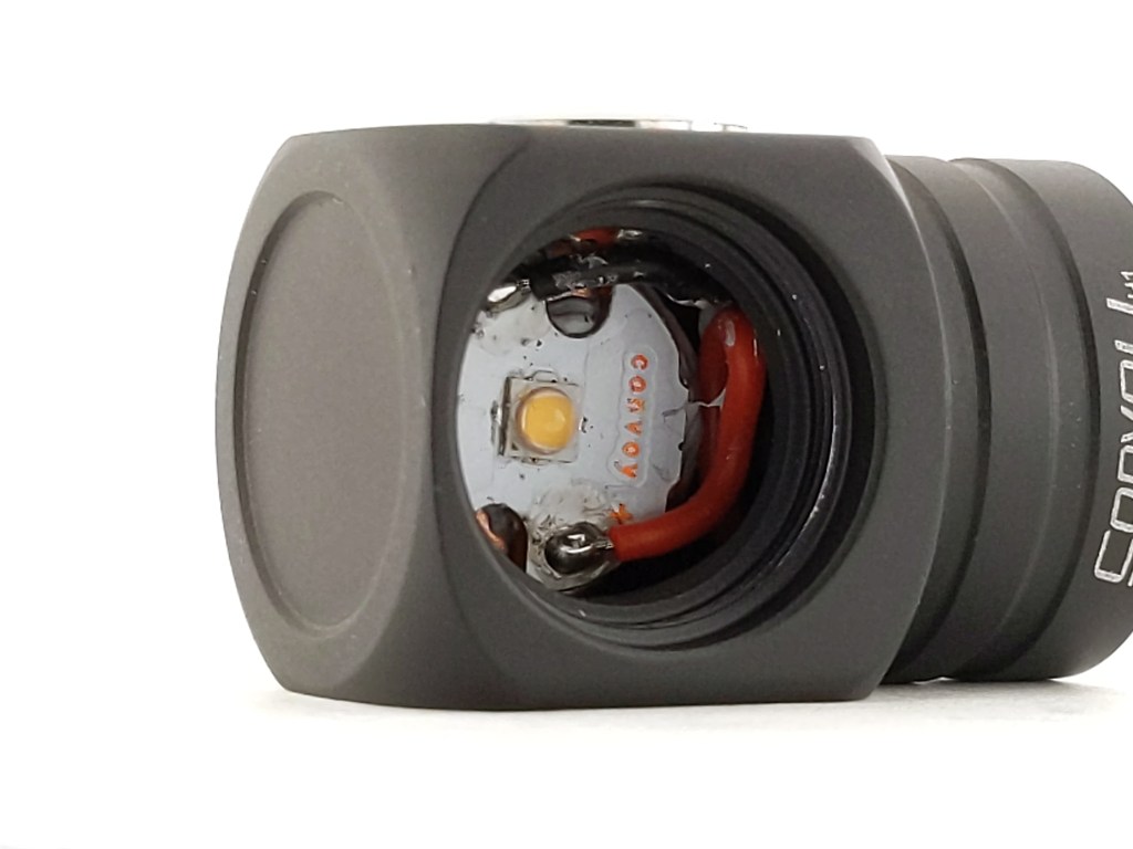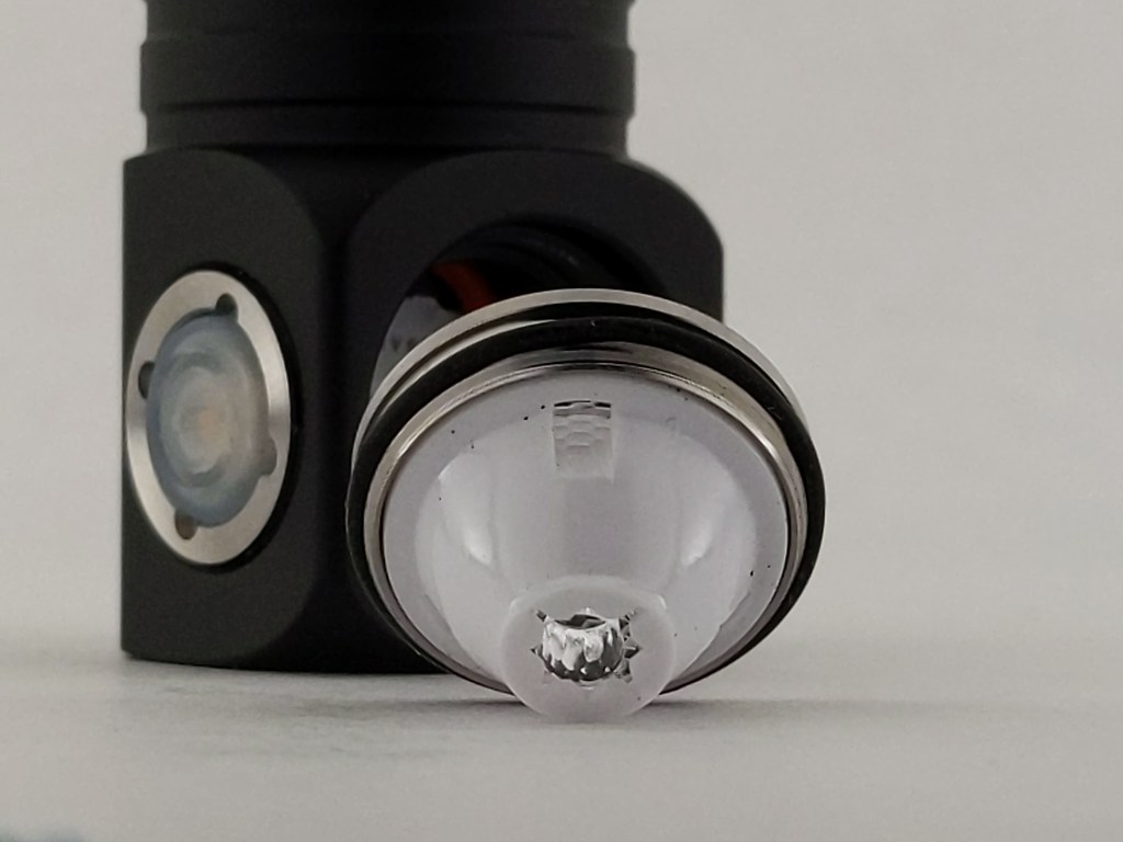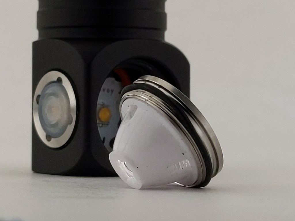 The emitter sits behind a beaded TIR optic. Initially upon this light’s release, some users realized this optic is much shallower than the reflector that H1 was initially designed for. The optic sat way above the emitter and produced a strange beam. This was brought to Simon’s attention and he subsequently started including a copper spacer underneath the MCPCB to raise the emitter up to the proper height for the optic.