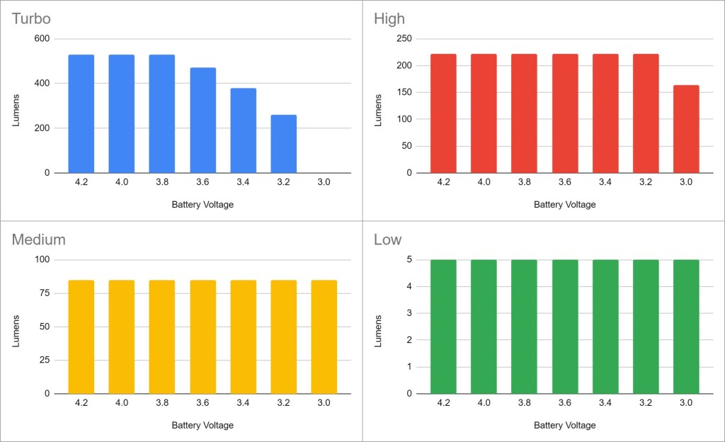 Regulation: is decent. It’s basically just Turbo that’s affected by cell voltage, and even then it only starts to be affected when the cell is half drained already. All regulation measurements are taken at turn-on so they do not reflect any thermal or low voltage stepdowns that may occur. A value of 0 indicates low voltage shutoff immediately upon activation.