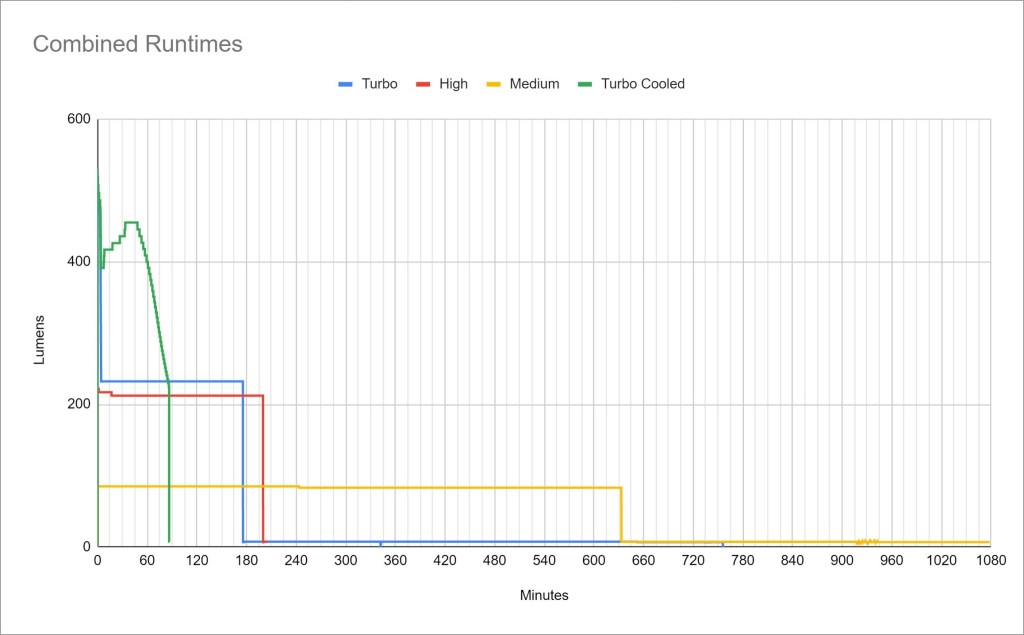 Turbo Cooled: starts out just like uncooled Turbo, but doesn’t drop as fast nor as far, and it picks back up a bit as the battery drains. This test was run with a household oscillating fan blowing directly on the light.
