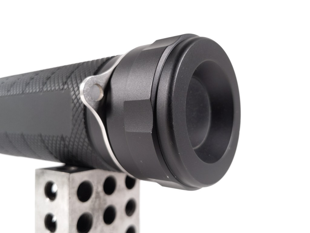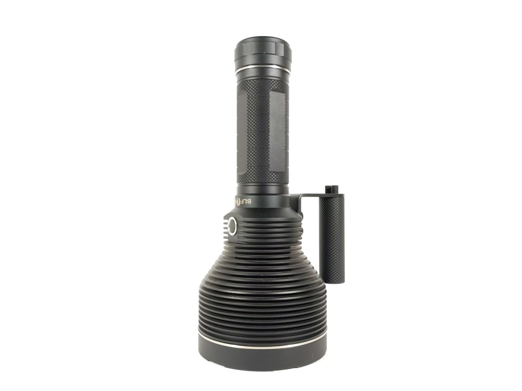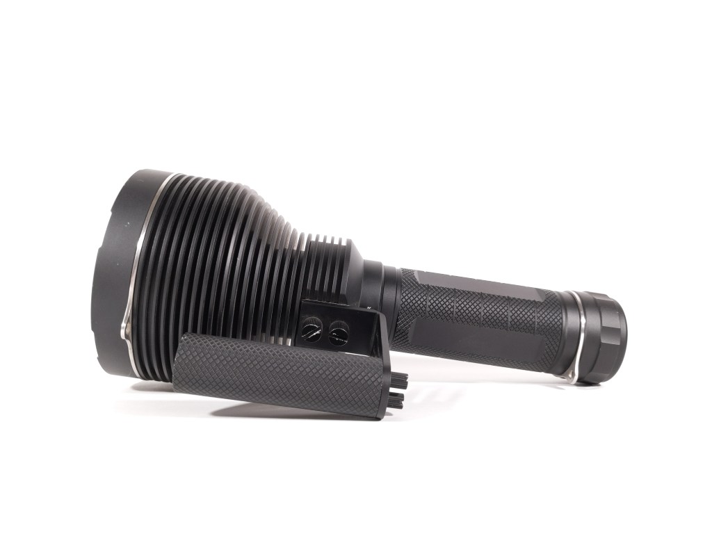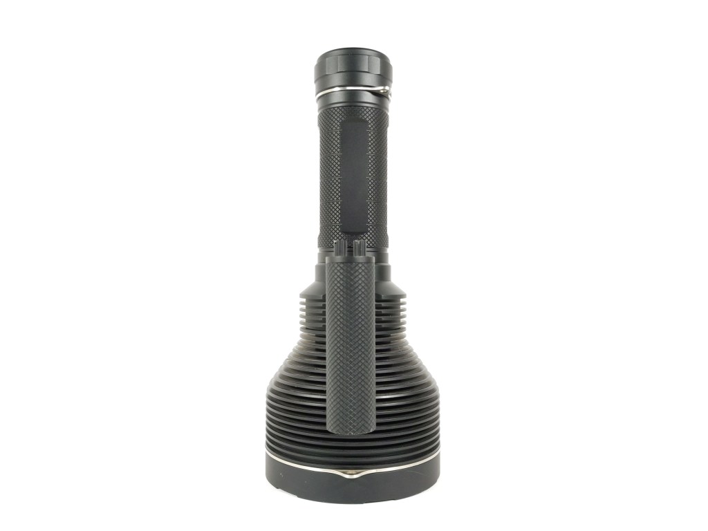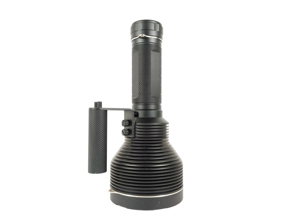 This thing is a beast and it’s too much to hold in one hand by the body tube. Thankfully, there’s a nice, ergonomic carry handle included and it works great. I have one, large complaint with the handle: the switch isn’t on it. It’s awkward and cumbersome to be holding the light by the handle in one hand and have to reach around to the other side with your opposite hand and press the switch. The switch should be on the end of the handle.