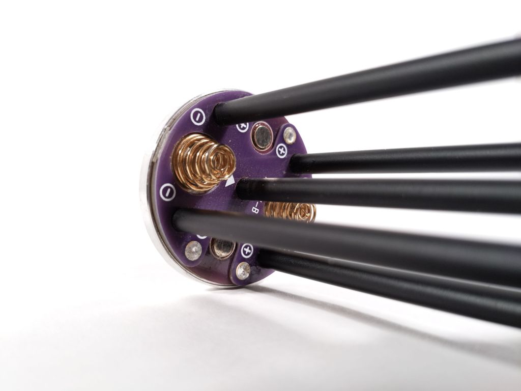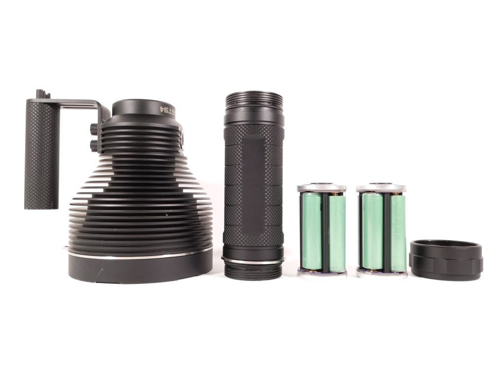 GT94 uses eight, unprotected, button-top, 18650 batteries. For best performance, use cells with a continuous draw rating of at least 10 amps. I’m using Sony VTC5A button tops. To hold all those batteries, a carrier is included. The owner of this light had some trouble with his carrier so he uses original BLF GT battery carriers instead and they work well, provided the center contacts are screwed on all the way.