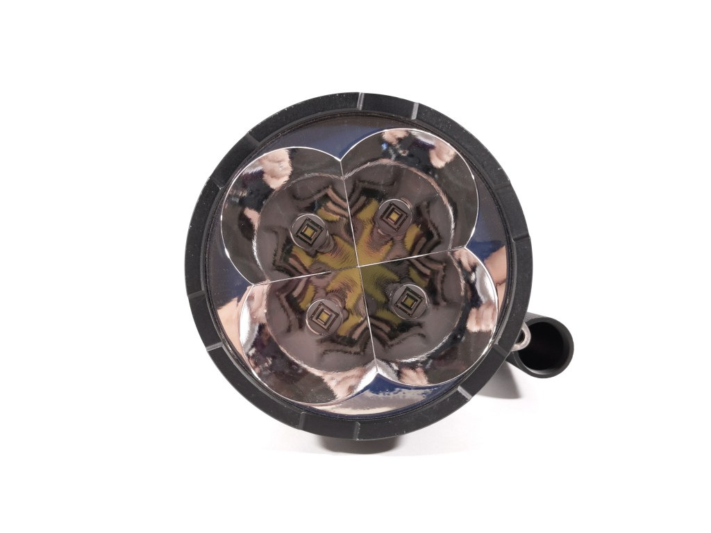 The beam is fairly clean for a quad reflector like this. There aren’t any weird artifacts aside from huge flower petals at the edges of the spill. Those are a result of the quad reflector. It’s pretty green at low levels but the tint cleans up a lot as soon as you exit the 7135-chip regulated levels and enter the FET driven levels.