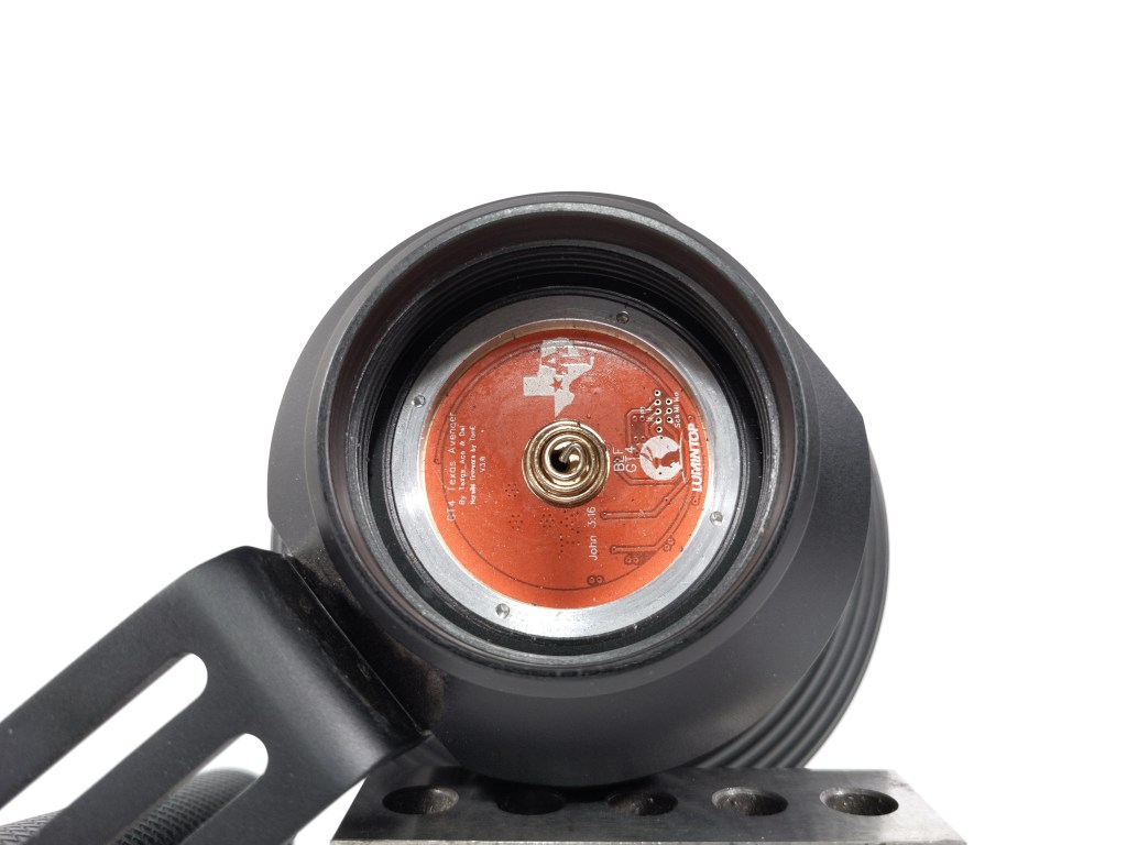 GT94 uses a “Texas Avenger” driver, developed by BLF member Texas Ace. I use one of his lumen tubes for my lumen testing. This is a FET+7135 driver, with the FET channel handling higher modes and the 7135 channel handling lower modes. I’m not certain how many 7135’s are present, but my guess is it’s just one, which is pretty disapointing.