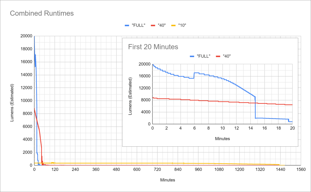 Please disregard the hump in the “FULL” line below. I had to adjust a fan during the test and it changed the readings slightly. In reality, there is no brightness increase at 6 minutes.