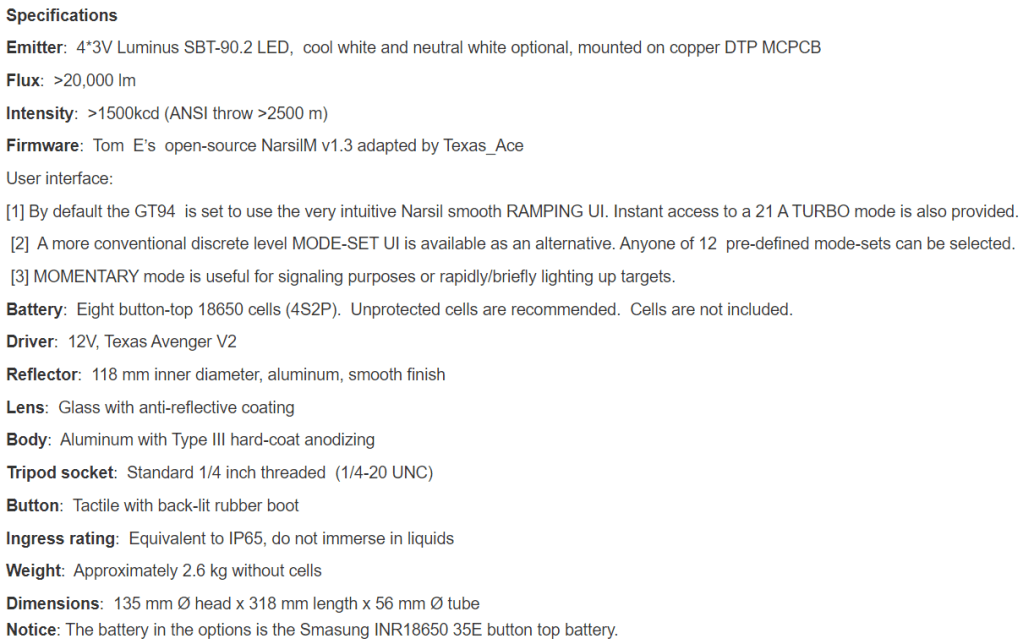 Reddit user u/calmlikea3omb (infamous for throwing a Zebralight in a fire) lent me this light for review. Here is the official product page. Below are the official specs. This light isn’t available anymore and it’s been replaced by GT94X, which is basically the same thing but with fewer, larger batteries.
