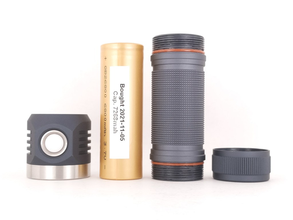 D4SV2 takes a single, unprotected, flat top, 26mm diameter cell. For best performance (especially with these W2’s) you really want a cell that’s rated for 20A (or more) continuous drain. By default a 26650 tube is included, but you can buy an optional (and highly recommended) 26800 tube for a few more dollars. I did all my testing with Queen Battery QB26800’s. It’s a big improvement and I think it fits the light better than a 26650. It makes it feel more like a scaled-up D4V2 ratter than just a fatter D4V2.