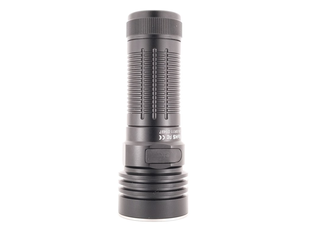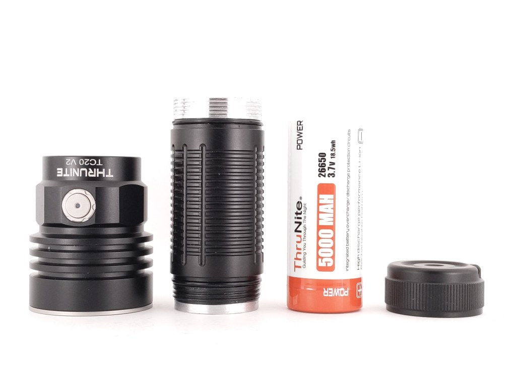 A 5000mah protected flat top 26650 cell is included and it doesn’t rattle inside the light at all. I measured 5470mah and 74mΩ IR on my SkyRC MC3000 charger. There are very stiff, dual springs in the tailcap and a brass button on the driver for contact. There is low voltage protection built into the light so you can safely use an unprotected 26650 should you so desire. I also tested with unprotected flat top 21700 and 18650 cells and both fit just fine, but the 18650 rattled a bit side to side. Make sure to use a cell with a continuous discharge rating of at least 8 amps just to be safe.