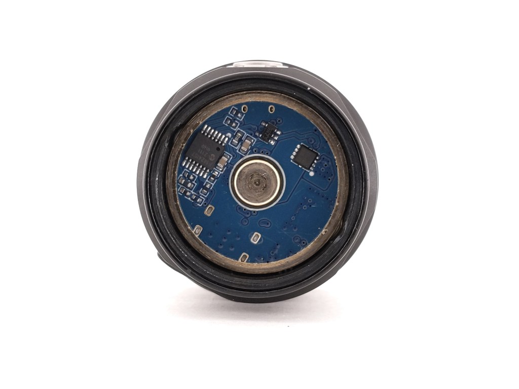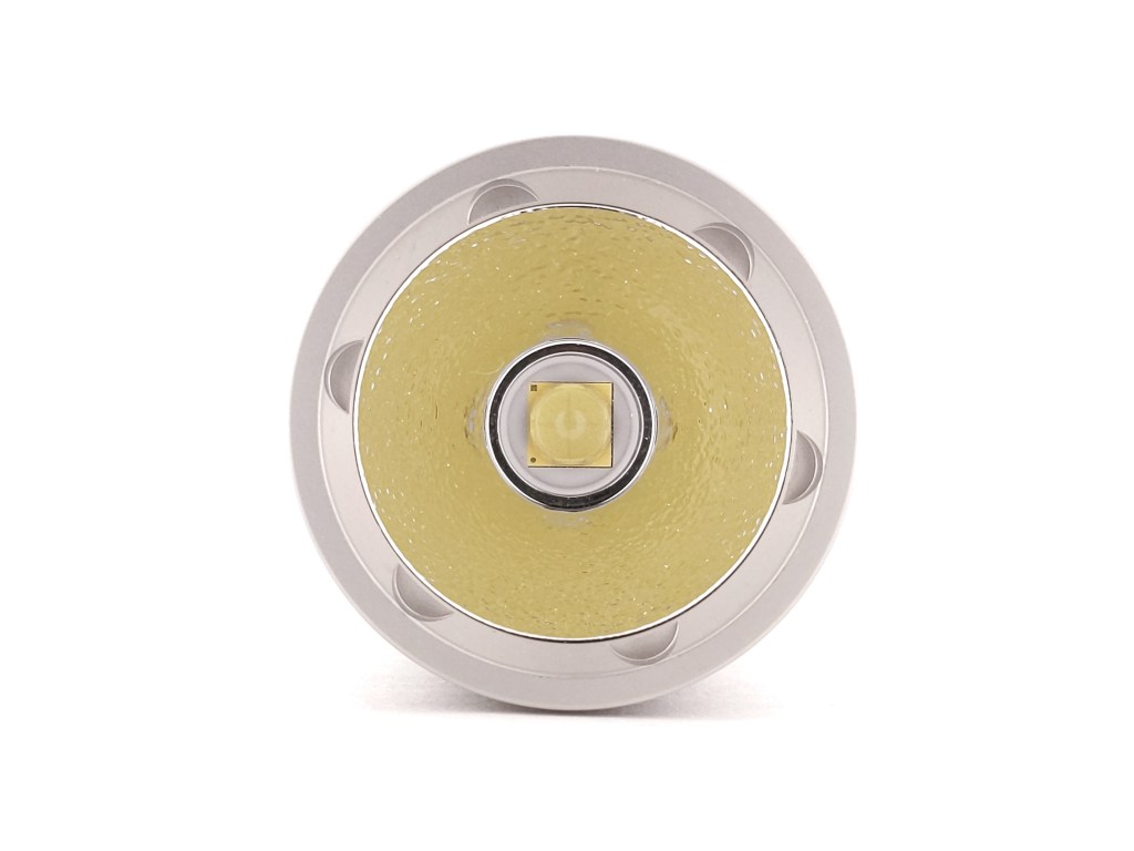 TC20 V2 uses a Cree XHP70.2 LED in a relatively shallow orange peel reflector. The bezel is not glued down and everything forward of the LED can be removed fairly easily. Notably, Thrunite is using a very large and non-standard square MCPCB. For TC20 V3, it would be nice to also have a Getian FC40 or FC60 LED option for less tint shift and better color.