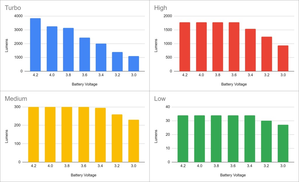 Performance: Turbo always steps down right at 3 minutes regardless of temperature, but after that stepdown the light is thermally regulated. Aside from thermal-related stepdowns, output is pretty flat.