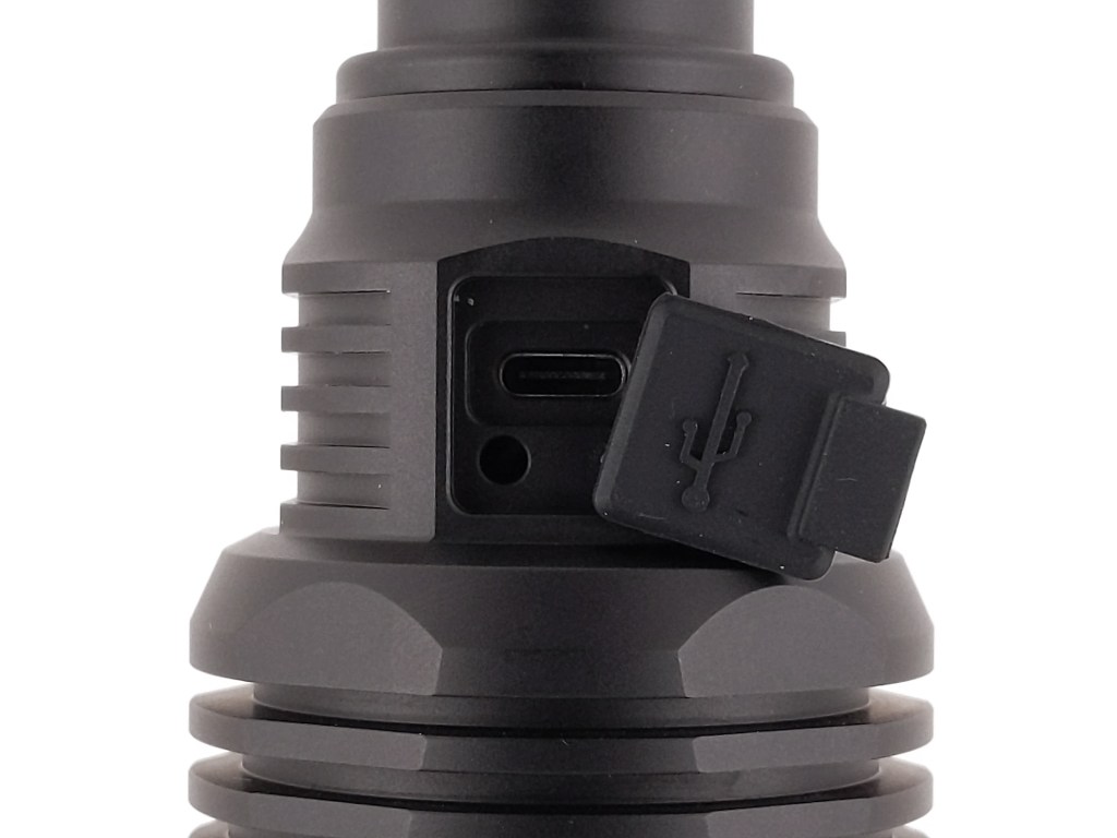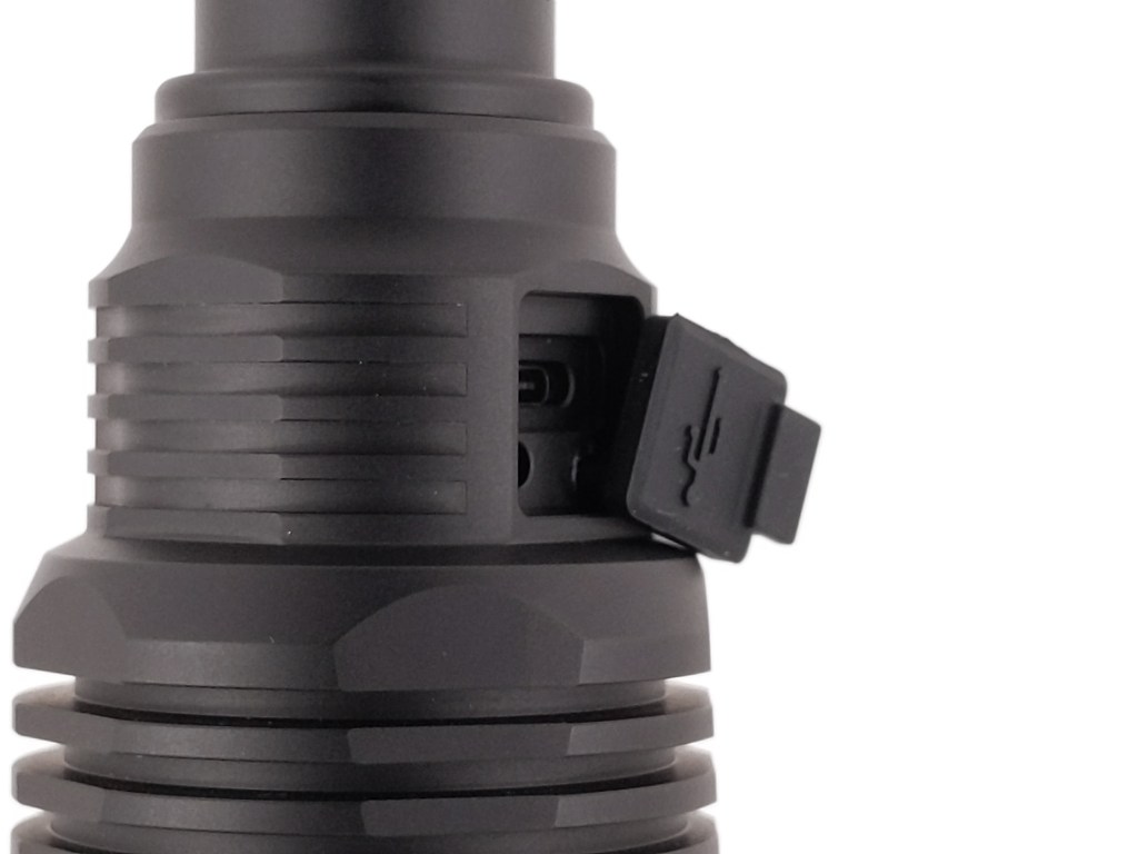 A USB-C port is is hidden under a rubber cover on the head, opposite the button. This port serves as a way to charge the light, and as a way to use the light as a powerbank for charging other devices. The cover is large and is not the most secure I have seen. In fact, when I was runtime testing the light, I heard a “pop”. Upon further investigation, I realized that the air inside the light heated up and expanded enough to pop the cover open. Needless to say, don’t take this light swimming.