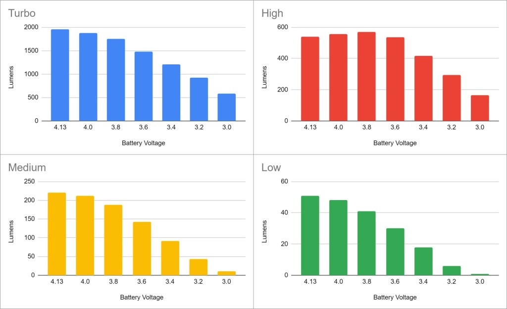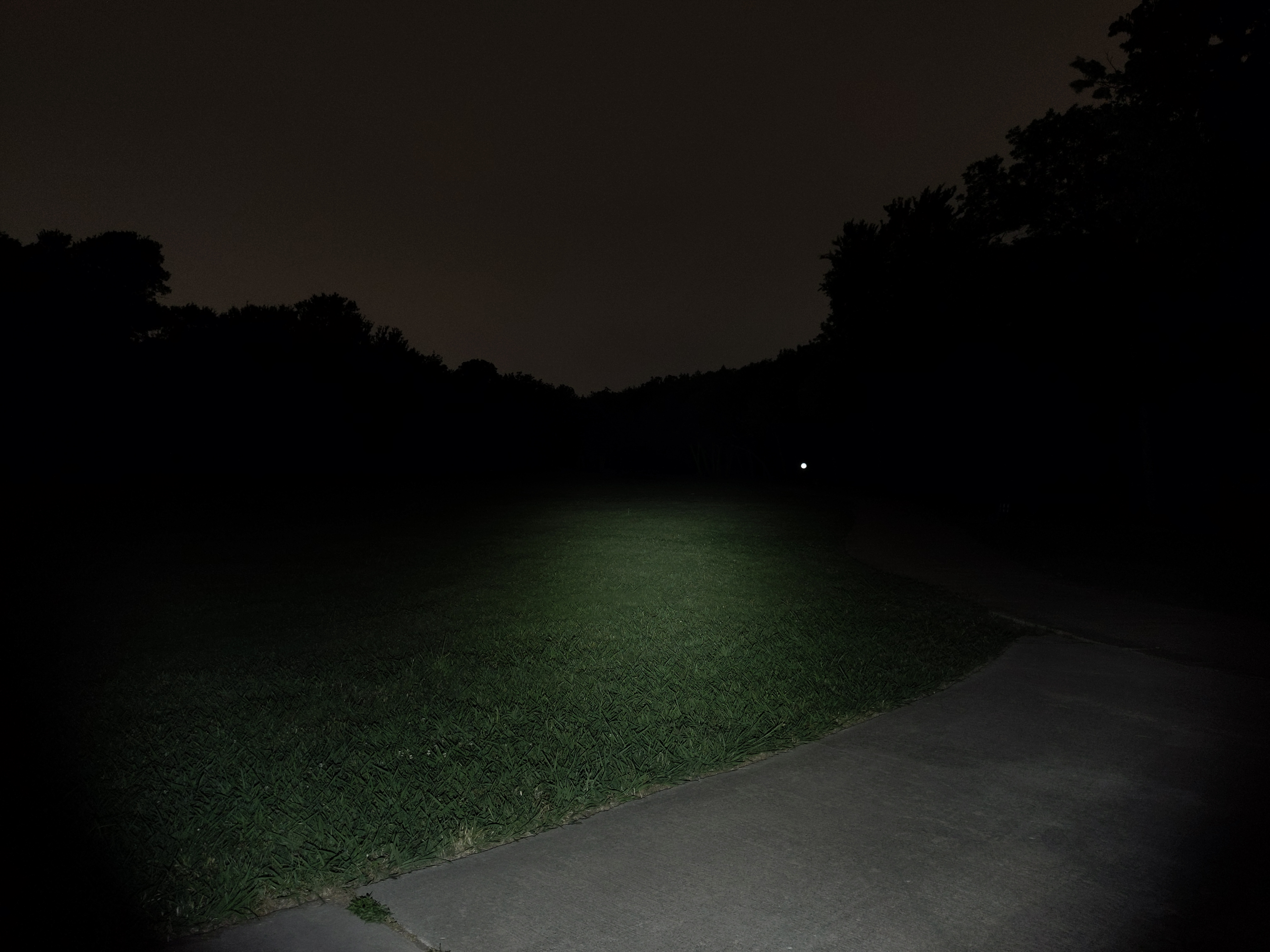 Disclaimer: Lumen measurements were taken on a Texas Ace 3.5″ Lumen Tube. A candela measurement was taken at 10 meters with an Opple Light Master Pro on the highest brightness, and other candela figures were calculated relative to that. CRI, CCT, & DUV data was taken for each mode from a few feet away at the center of the hotspot with the Opple Light Master and Waveform DUV Calculator. Runtime tests were performed with the Ceilingbounce app on my smartphone. All of these tests were performed with a fully charged included battery unless otherwise specified. I cannot measure moonlight directly, so moonlight readings are calculated based on the brightness relative to the next-lowest mode. None of this is professional equipment, so take all of these measurements with a grain of salt.