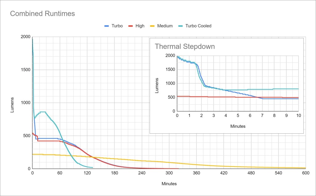 Performance: Turbo starts out just under 2000 lumens and starts thermal stepdown just before the 2 minute mark. Thrunite claims Turbo lasts for 7 minutes, but that’s how long it takes to completely settle, not how long Turbo actually lasts. Except for the brief Turbo blip in the beginning, high and Turbo mode look exactly the same. Thermally stable output is just under 500 lumens.