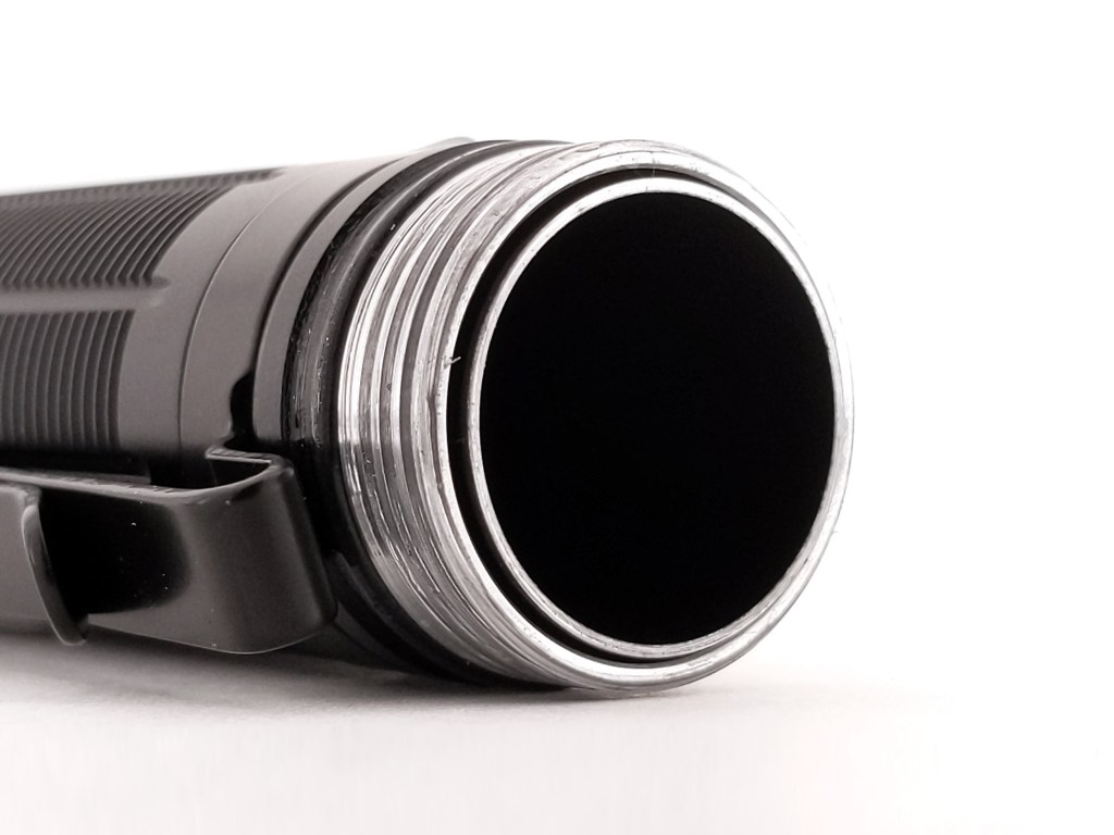 Build quality is a little bit above average, like most Thrunite products. The anodizing is nice and evenly applied. It’s a very deep black, which you can see in the size comparison photo in the next section. The pocket clip had some nicks when I took the photos but those are probably just from me carrying the light around. The tail threads are unanodized which will improve reliability on a dual-switch instant-turbo light like this. They are nicely machined and well lubricated but they’re a little hard to start. The body tube and head are glued, but that helps with reliability and you wouldn’t be changing the driver out on this light anyway. My only real quality-qualm is the side switch, which I’ll discuss more in the switch section.