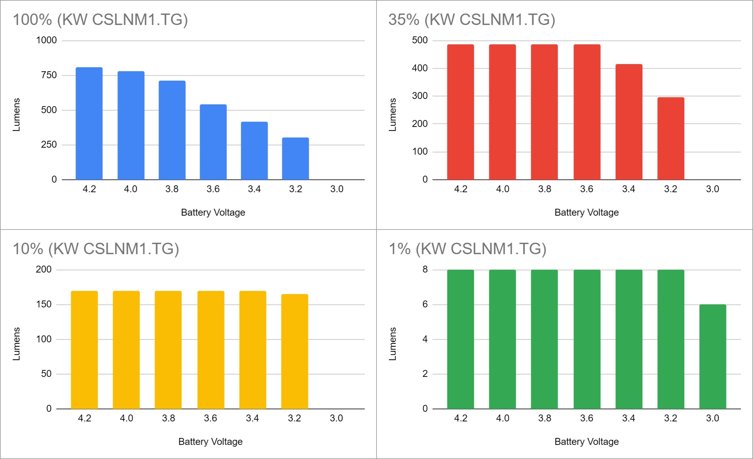 Disclaimer: Lumen measurements were taken on a Texas Ace 3.5″ Lumen Tube. A candela measurement was taken at 10 meters with an Opple Light Master III on the highest brightness, and other candela figures were calculated relative to that. CRI, CCT, & DUV data was taken for each mode from a few feet away at the center of the hotspot with the Opple Light Master and Waveform DUV Calculator. Runtime tests were performed with the Ceilingbounce app on my smartphone. All of these tests were performed with a fully charged Molicel M35A battery unless otherwise specified. I cannot measure moonlight directly, so moonlight readings are calculated based on the brightness relative to the next-lowest mode. None of this is professional equipment, so take all of these measurements with a grain of salt.