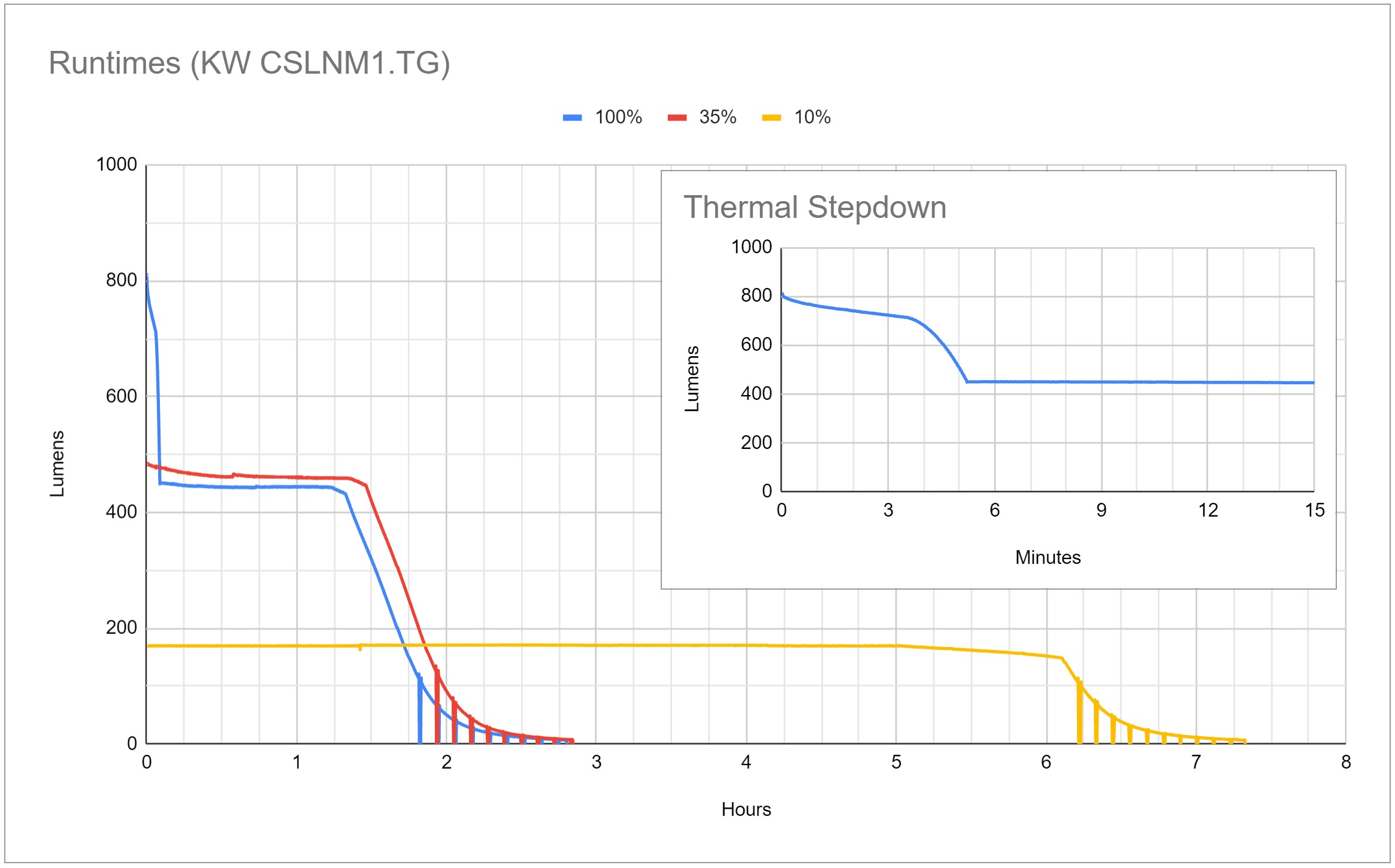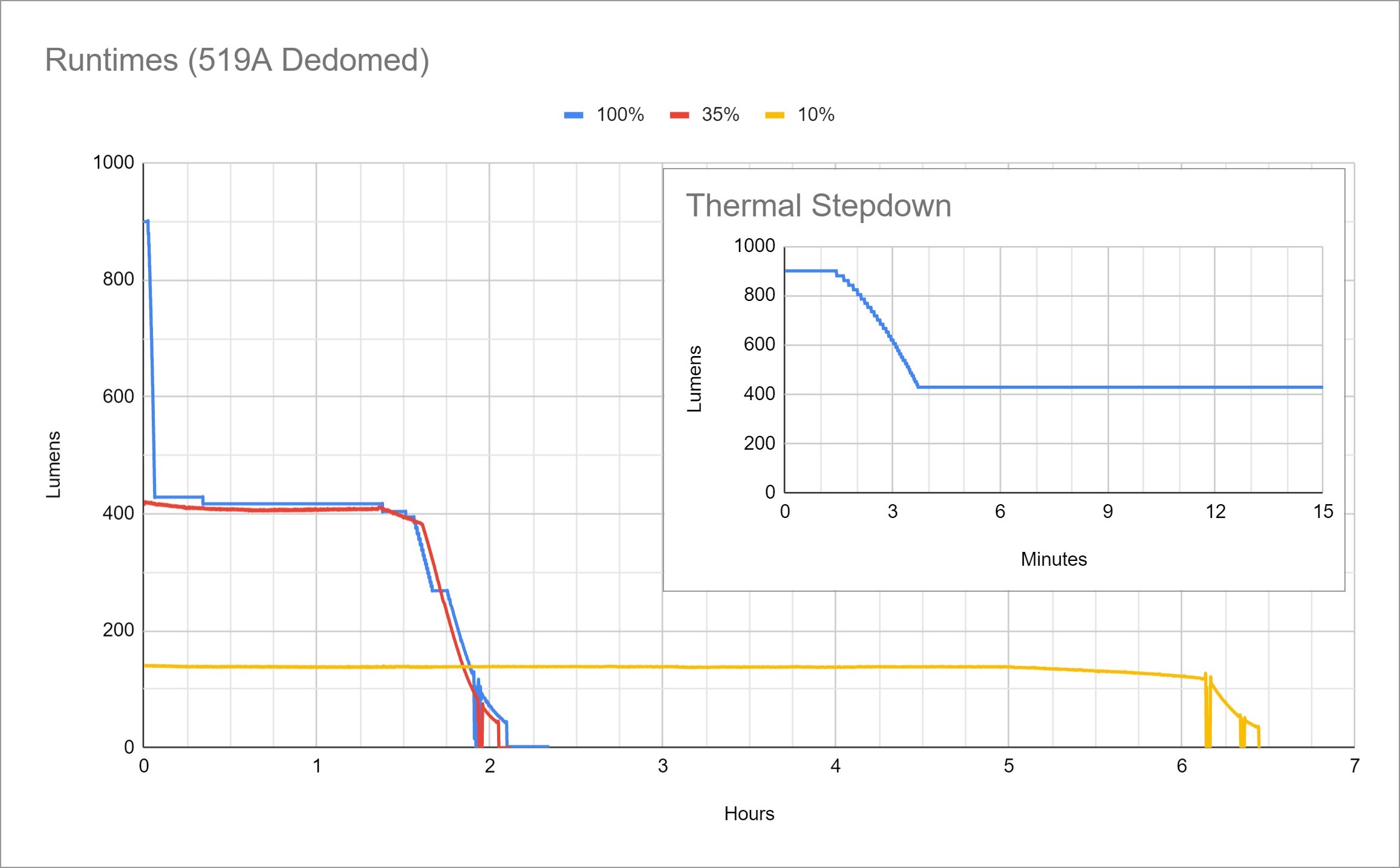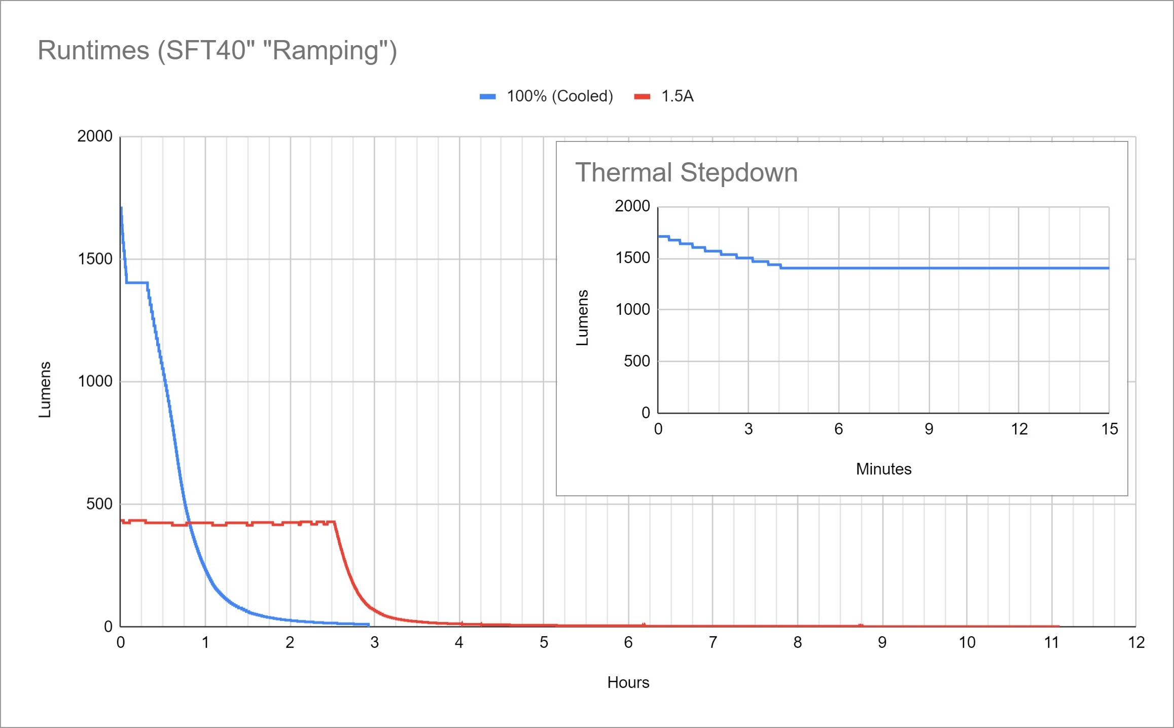 The instant stepdowns in these graphs are caused by some combination of battery voltage sag and/or the emitter and driver heating up I believe. Thermal regulation does not kick in on the 12-group drivers until 1.5-3.5 minutes depending on the LED.