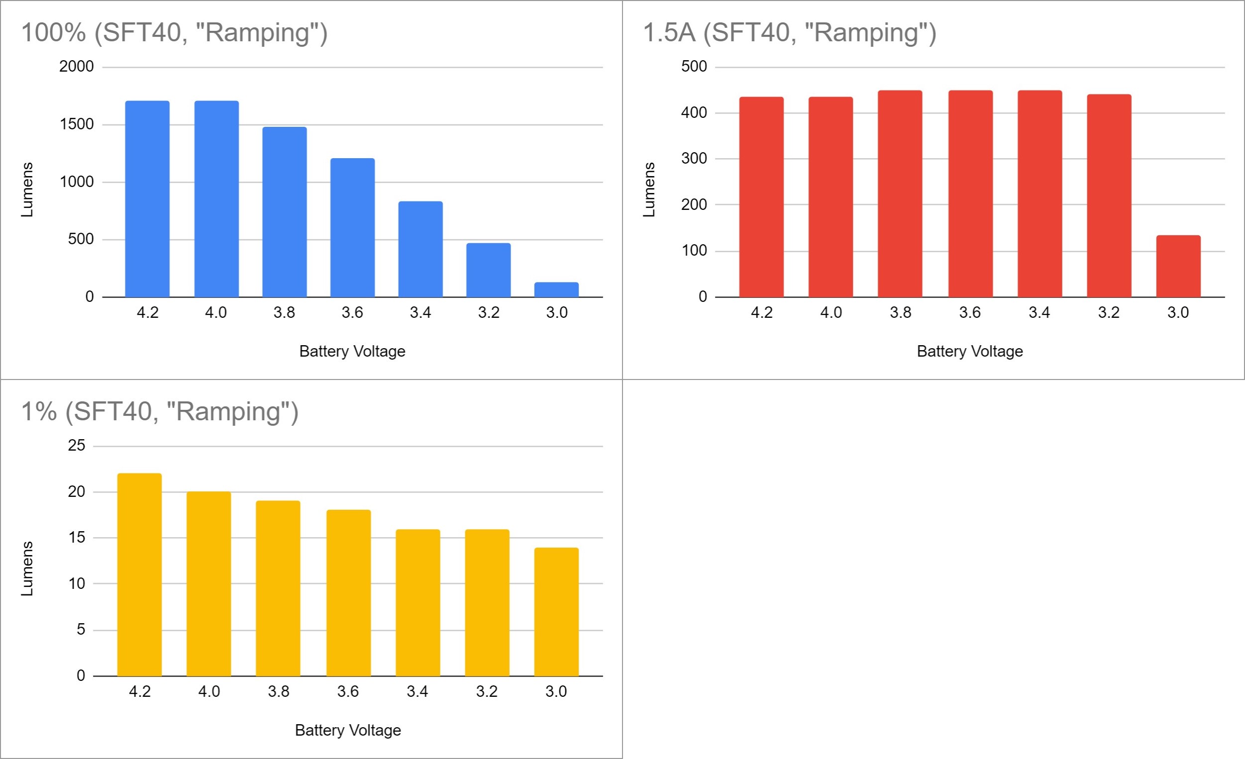 - SFT40: “Ramping”: This is a weird driver with a weird UI (that doesn’t “ramp”), no thermal regulation, no low voltage protection, no mode memory, and only slightly more current than the 5A 12-Group driver. I recommend foregoing this driver and choosing the 5A 12-Group driver for use with SFT40 instead. I couldn’t see or hear any PWM. My Opple Light Master picked up some mild flickering on 100% and 1.5A modes, but it wasn’t PWM. It only appears to be regulated on the middle 1.5A mode, which is weird.