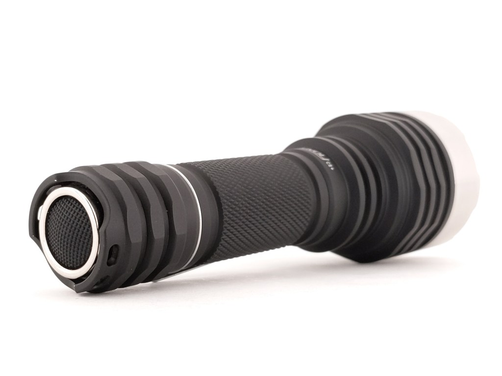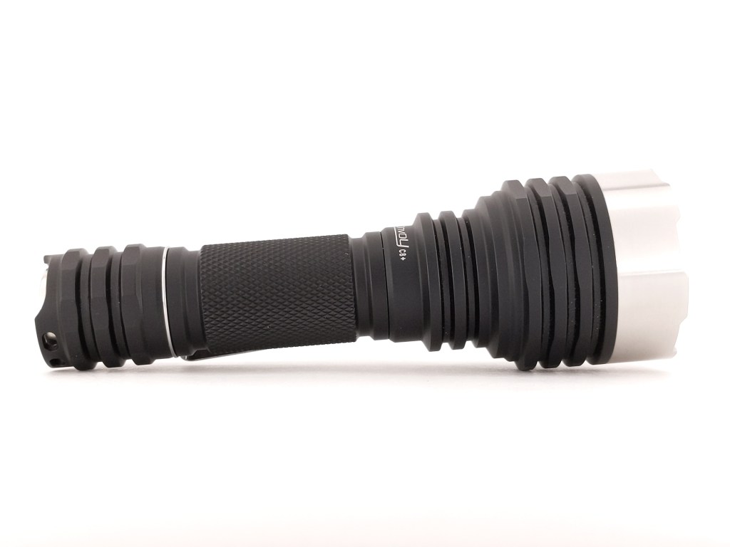 C8+ is an evolution on the venerable and widely used C8 design. There’s a long, narrow body tube that houses the battery and switch with a wide flared head for throw. There are some fins on the head to help keep it cool, and some crenulations in the bezel so you can see when it’s on even when face-down.