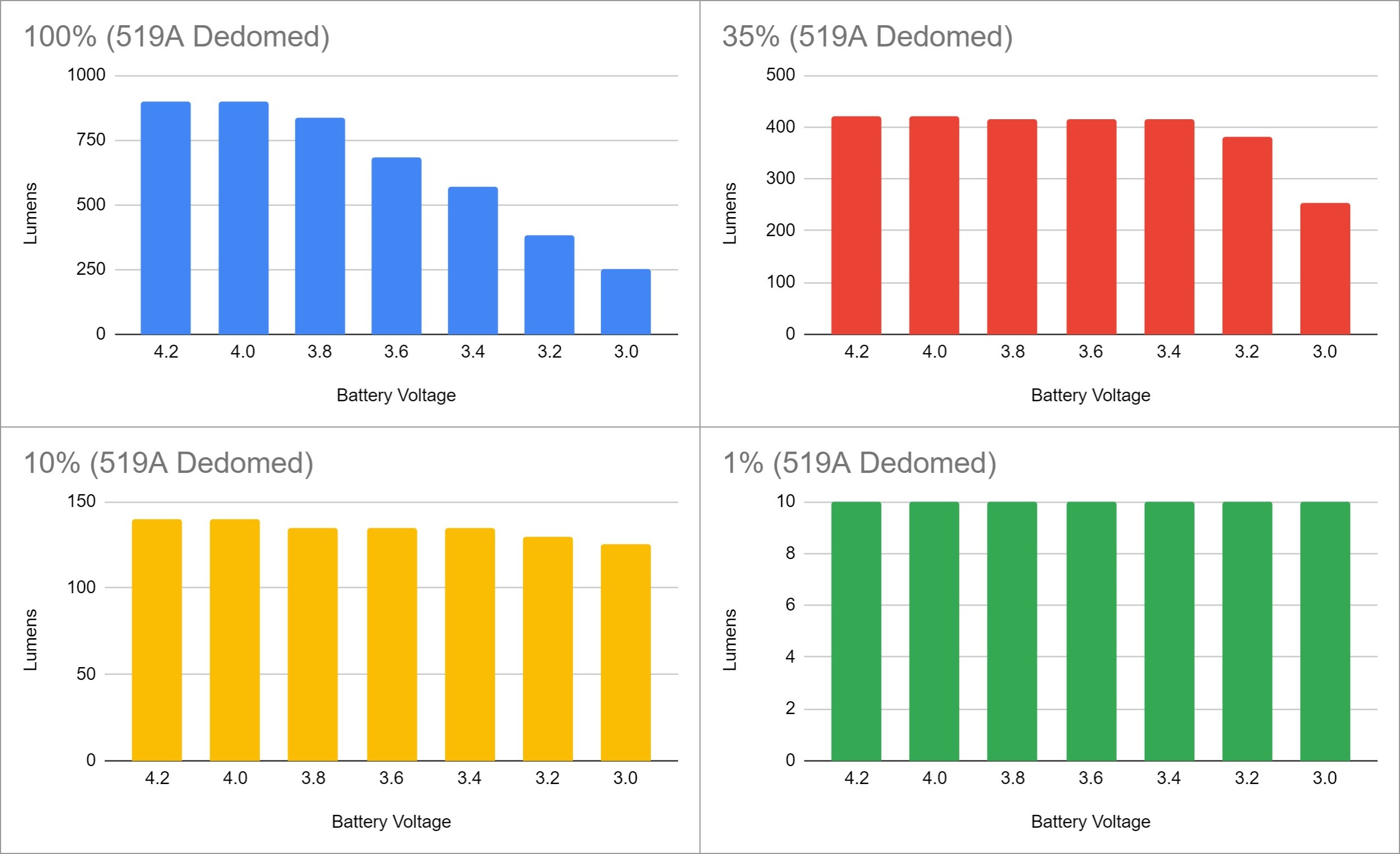 Mode Spacing: depends on the mode group & emitter you choose. For example, despite using the same driver, my 519A sample and my W1 sample have slightly different mode spacing just because the LED’s have different efficiency curves. To be more specific, the difference between 35% and 100% modes on the W1 version is very small, so small it’s hard to see, and that’s normal.