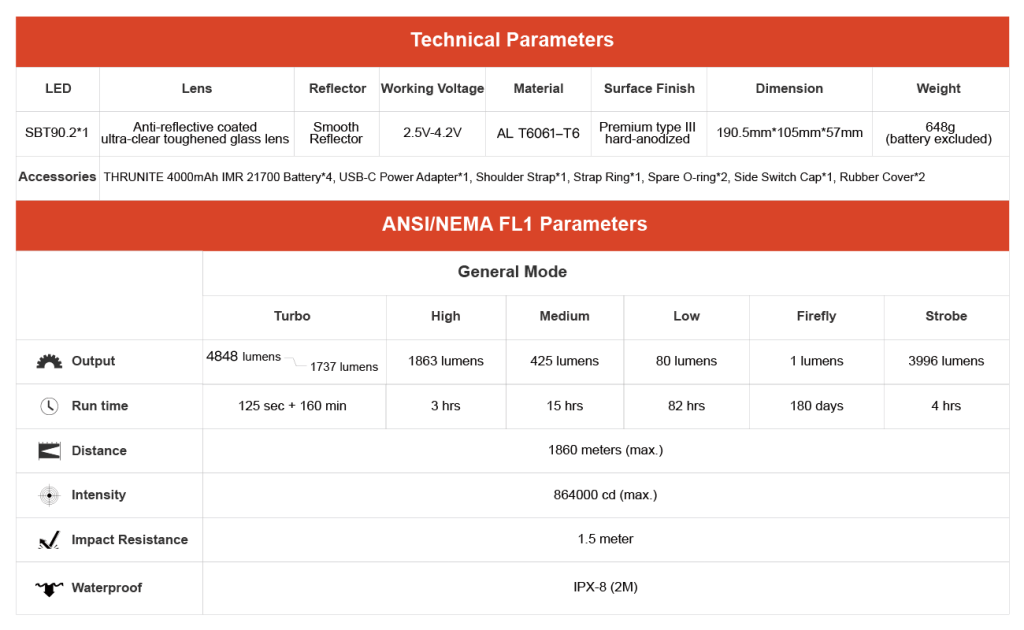 Thrunite have put together a really compelling package here, a really accessible package. This is another Thrunite that I can recommend to just about anyone. It’s available on Amazon, the UI is simple, it’s got batteries included, and has USB-C charging built in. All of it’s competitors have some weird caveat like “but you have to wait a month to get it” or “you have to buy batteries and a charger separately” or “you have to remove the batteries for recharging”. Thrunite removed all the barriers to entry. If you need an easy-to-use and easy-to-buy mega thrower, this is the light for you.
