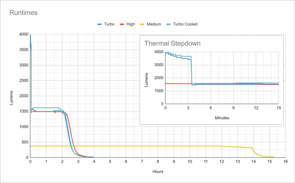 Performance: Turbo always steps down after 3 minutes. Sustained output is about 1500 lumens. On Turbo and High the light will get too hot to hold of it’s sitting on a table, but if there’s a breeze or if you’re holding it the whole time it should be manageable.
