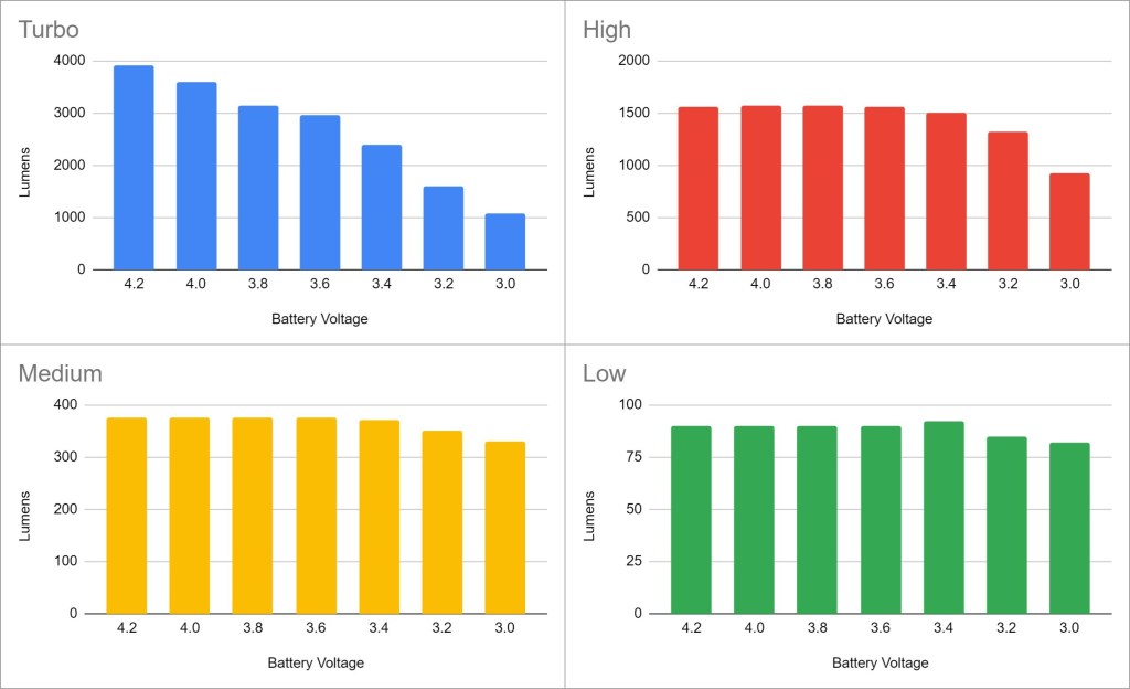 Regulation is about average. Turbo is heavily affected by battery voltage and that’s not what I was hoping for on a $250-$300 light, especially considering that a $100 Convoy L7 with the same LED manages perfect regulation.