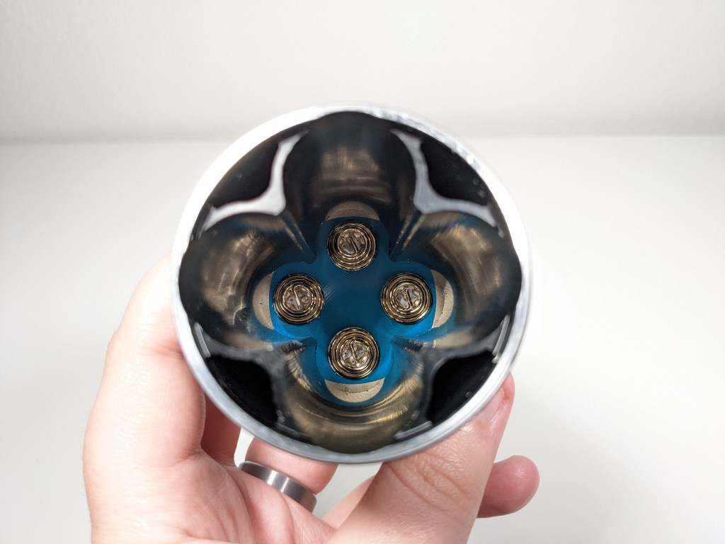 TN42 V2 uses four button top 21700 batteries, and they have to be pretty long to fit. Thrunite includes four 4000mah cells. For some reason the included cells are proprietary, even though they don’t need to be, and that bugs me. Normal button tops will work fine. The cells are in parallel so you can use the light with all four cells or as few as one.