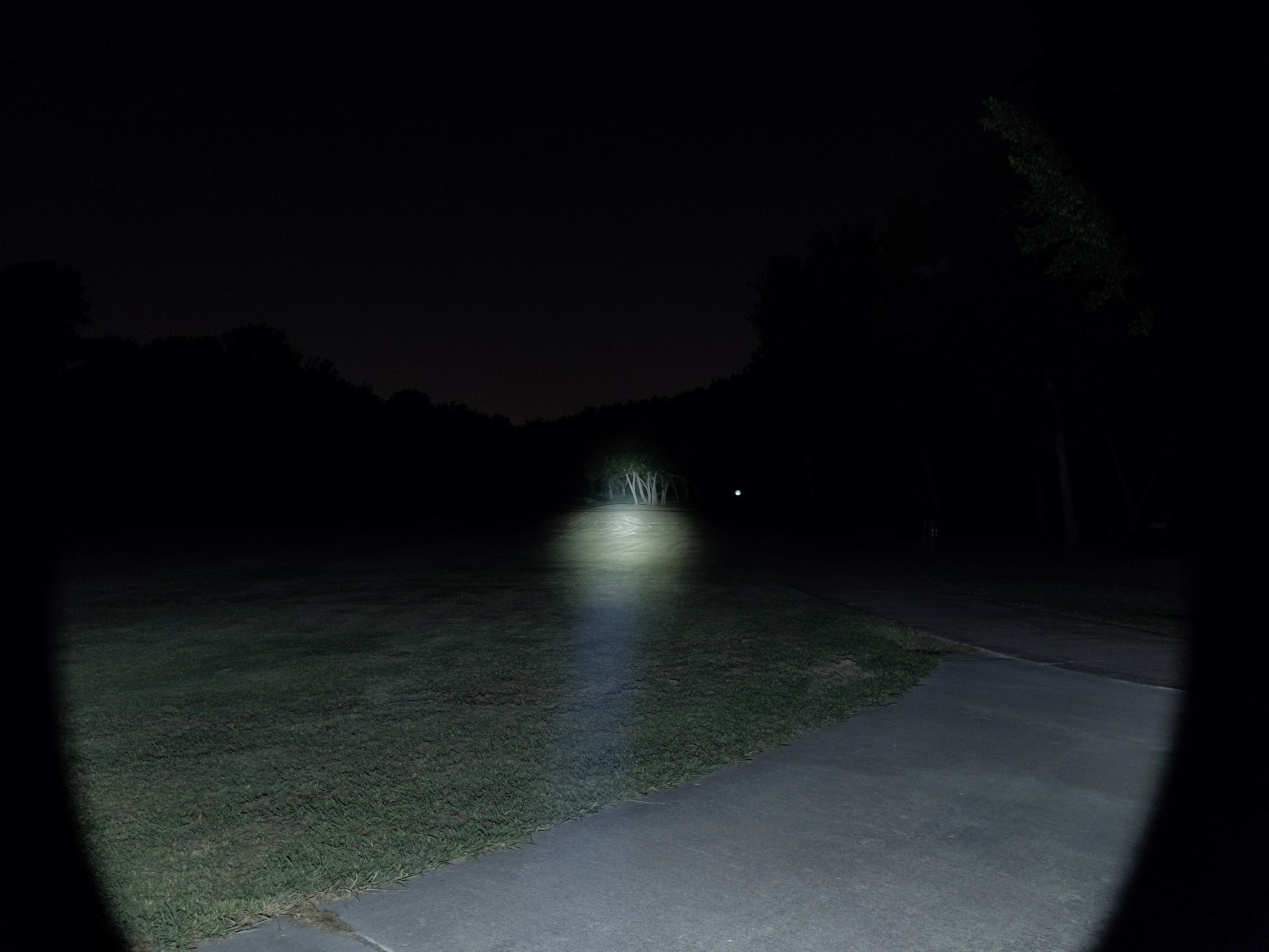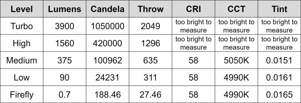 Disclaimer: All measurements taken at turn-on. Lumen measurements were taken on a Texas Ace 3.5″ Lumen Tube. A candela measurement was taken at 10 meters with an Opple Light Master III on the highest brightness, and other candela figures were calculated relative to that. CRI, CCT, & DUV data was taken for each mode from a few feet away at the center of the hotspot with the Opple Light Master and Waveform DUV Calculator. Runtime tests were performed with the Ceilingbounce app on my smartphone. All of these tests were performed with fully charged included batteries unless otherwise specified. I cannot measure moonlight directly, so moonlight readings are calculated based on the brightness relative to the next-lowest mode. None of this is professional equipment, so take all of these measurements with a grain of salt.