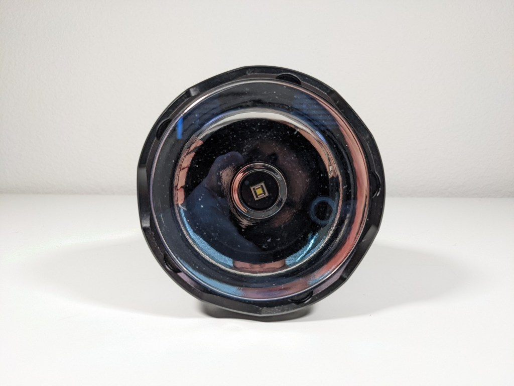 Thrunite chose the ultimate LED to put in this monster thrower: a Luminus SBT90.2. It’s a 3V LED with a huge footprint but small die, capable of drawing over twenty amps in some situations. It sits beneath a huge, deep, smooth reflector. Unfortunately, I’m unable to remove the bezel and get a closer look.