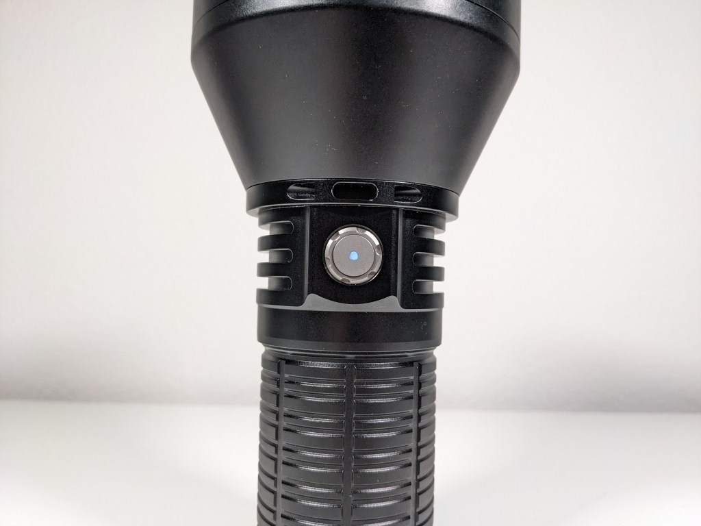There’s a large electronic switch on the side of the light. There’s a silver plastic boot covering it, with a small translucent area in the middle for battery status indication. Blue means good charge, red means low, and flashing red means critically low. It would have been nice to see a multi-LED indicator somewhere on the light with 4-5 LED’s in a row to give you a better sense of how much battery is left. This works fine though. It’s a decent switch that’s easy to find in the dark and plenty clicky. Just make sure to use mechanical lockout by loosening the battery tube if you throw the light in a bag. The switch is not particular well protected from accidental bumps.