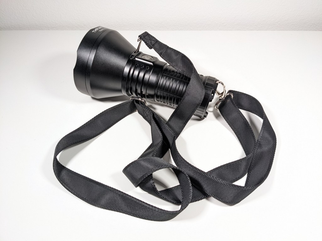 The only included carry method is a shoulder strap, and it’s brilliant. Many other lights this size come with a removable carry handle, but they still require you to carry the light in your hand. They also typically mount on the opposite side from the button so you have to use both hands to turn them on and off. TN42 V2’s shoulder strap attaches to the tailcap and right in front of the button, so it holds the light pointing forward with the switch upright. That means you can have full control of the light just by reaching down and your thumb will land on the button naturally. This is an awesome inclusion.