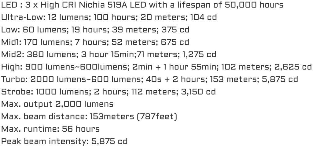 Disclaimer: All measurements taken at turn-on. Lumen measurements were taken on a Texas Ace 3.5″ Lumen Tube. A candela measurement was taken at 10 meters with an Opple Light Master III on the highest brightness, and other candela figures were calculated relative to that. CRI, CCT, & DUV data was taken for each mode from a few feet away at the center of the hotspot with the Opple Light Master and Waveform DUV Calculator. Runtime tests were performed with the Ceilingbounce app on my smartphone. All of these tests were performed with a fully charged included battery unless otherwise specified. I cannot measure moonlight directly, so moonlight readings are calculated based on the brightness relative to the next-lowest mode. None of this is professional equipment, so take all of these measurements with a grain of salt.