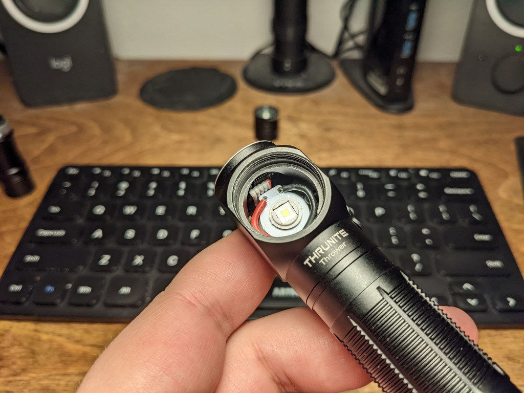 Thrunite chose the best overall throw LED on the market right now: Luminus SFT40. They could not have picked a better LED here. It sits in a smooth reflector to maximize throw. I was unable to loosen the bezel retaining ring and get inside with normal tools, but I designed & 3D printed a bezel removal tool (STL) that did the trick though.