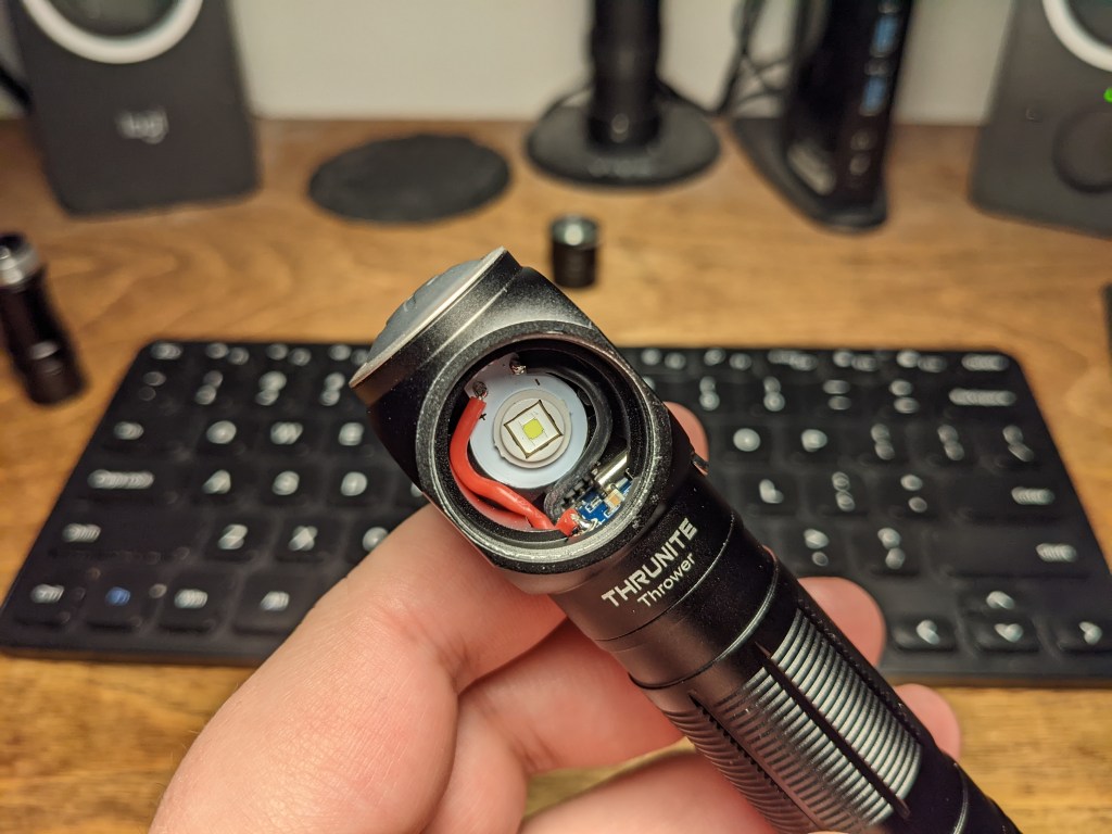 It’s pretty cramped in there. The MCPCB is a weird shape so emitter swaps may only be possible via reflow, and there aren’t really any other compelling 3V 5050 LED’s on the market at the moment.