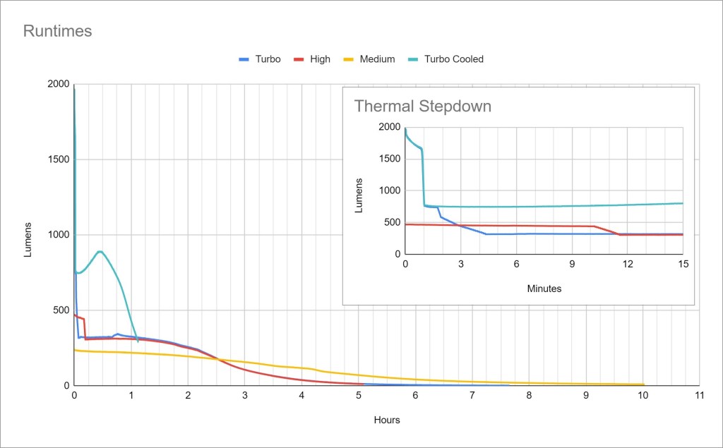 Thermal regulation: is present and work well but only after the initial timed Turbo stepdown at 1 minute. “Sustained” output increased to ~800lm when cooled.