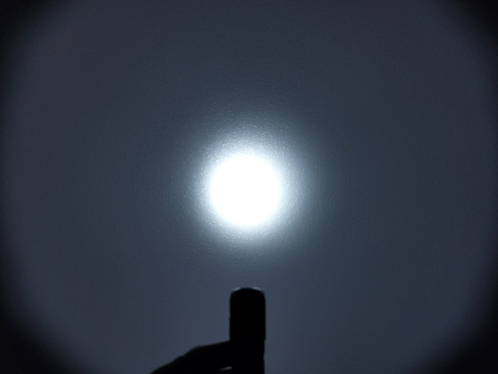 The beam is very narrow for a headlamp. It’s kind of fun as a handheld because it feels a bit like a laser pistol. It’s surprisingly clean too, with the only artifacts being a ring outside the spill and six small spikes in the edge of the spill due to the cutouts on the bezel.