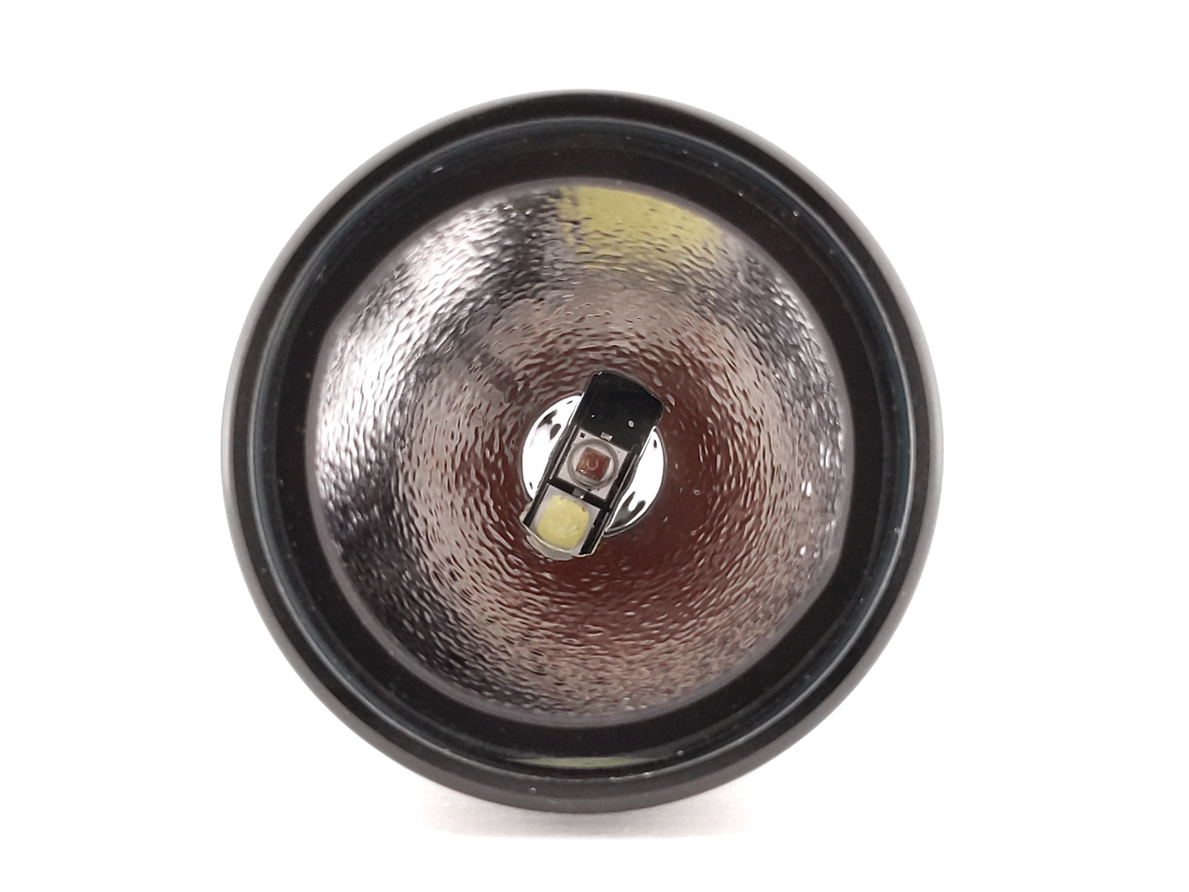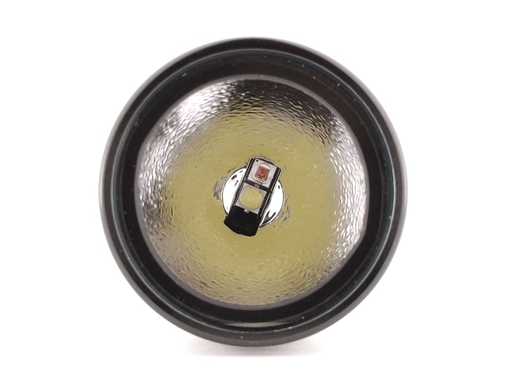 P5R’s big feature is the dual-color white-or-red beam. There’s one white LED and one red led, but unlike most dual-color lights they share the same reflector. To switch colors, rotate the ring on the head and it will physically move the LED’s to change color! That allows both colors to take advantage of that large orange-peel reflector for a great beam profile. I’ve never seen this on another light and it’s a very clever innovation. I don’t know the exact model of these LED’s.